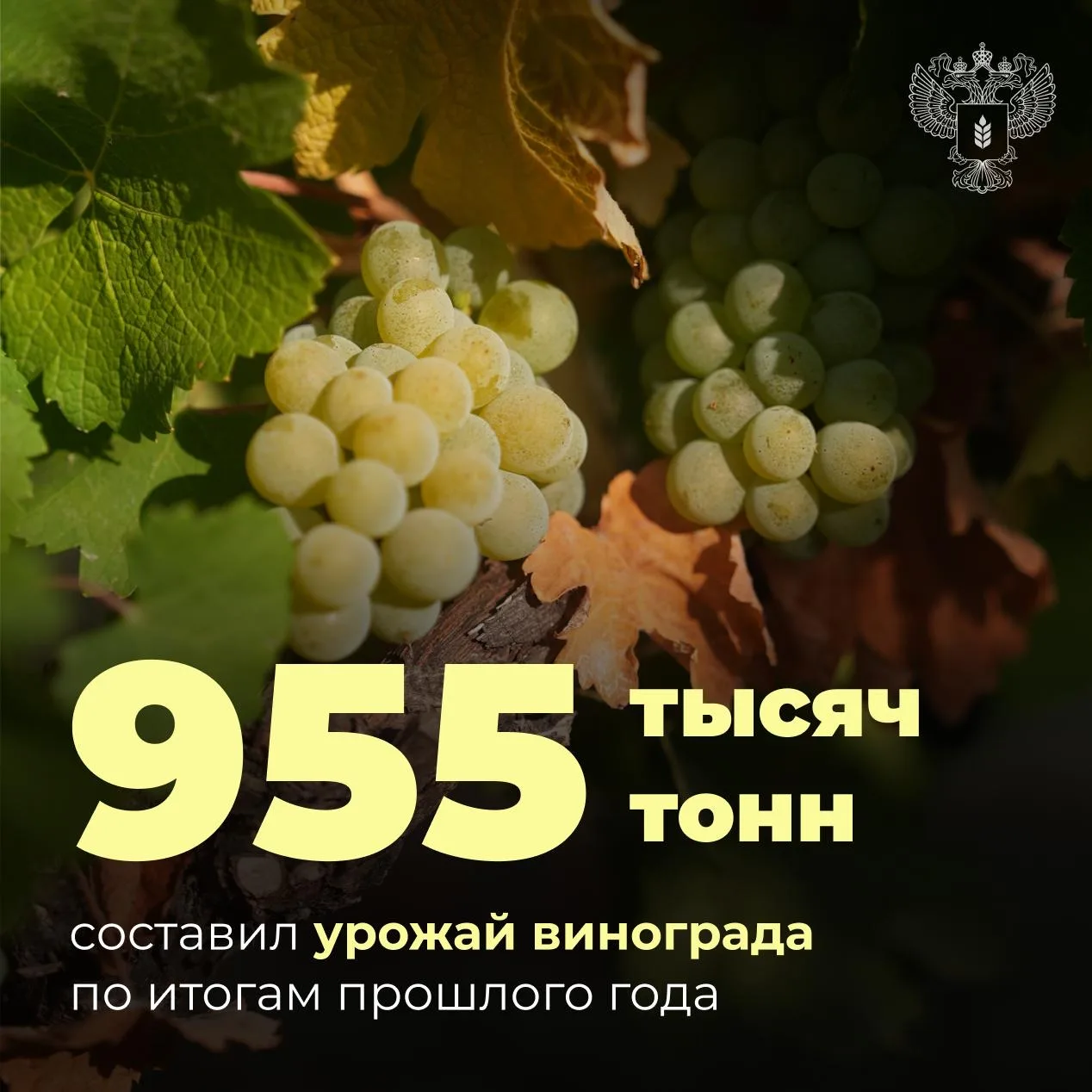 🍇 По итогам прошлого года урожай винограда составил 955 тысяч тонн.