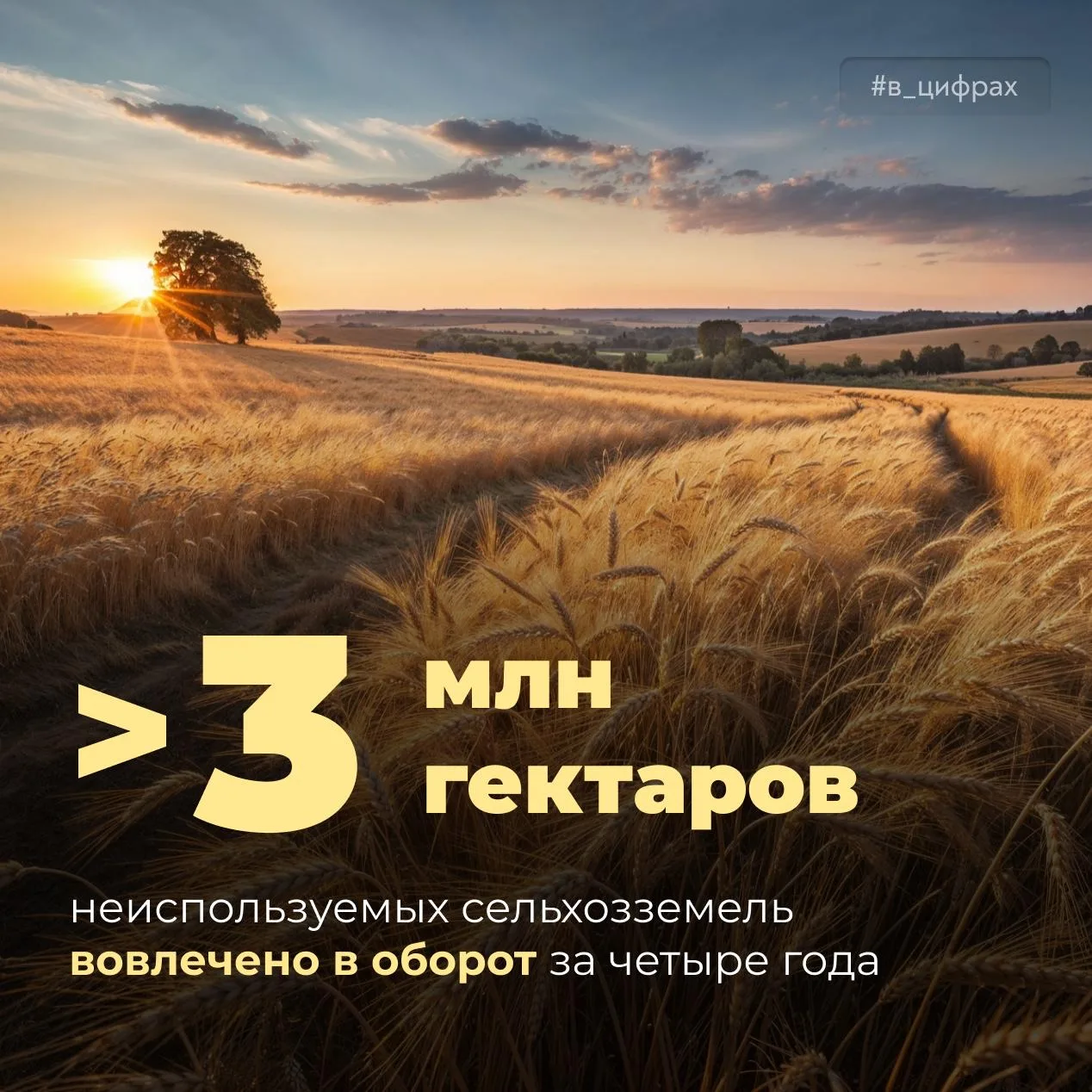 ➡️ За четыре года в оборот введено 3,3 млн гектаров ранее неиспользуемых земель – почти на 300 тысяч выше плана.