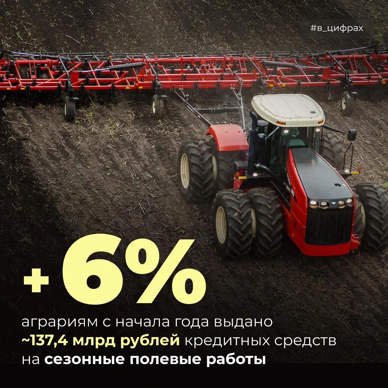 🚜 Объем кредитных средств, выданных ключевыми банками на проведение сезонных полевых работ, с начала года составил ~137,4 млрд рублей.