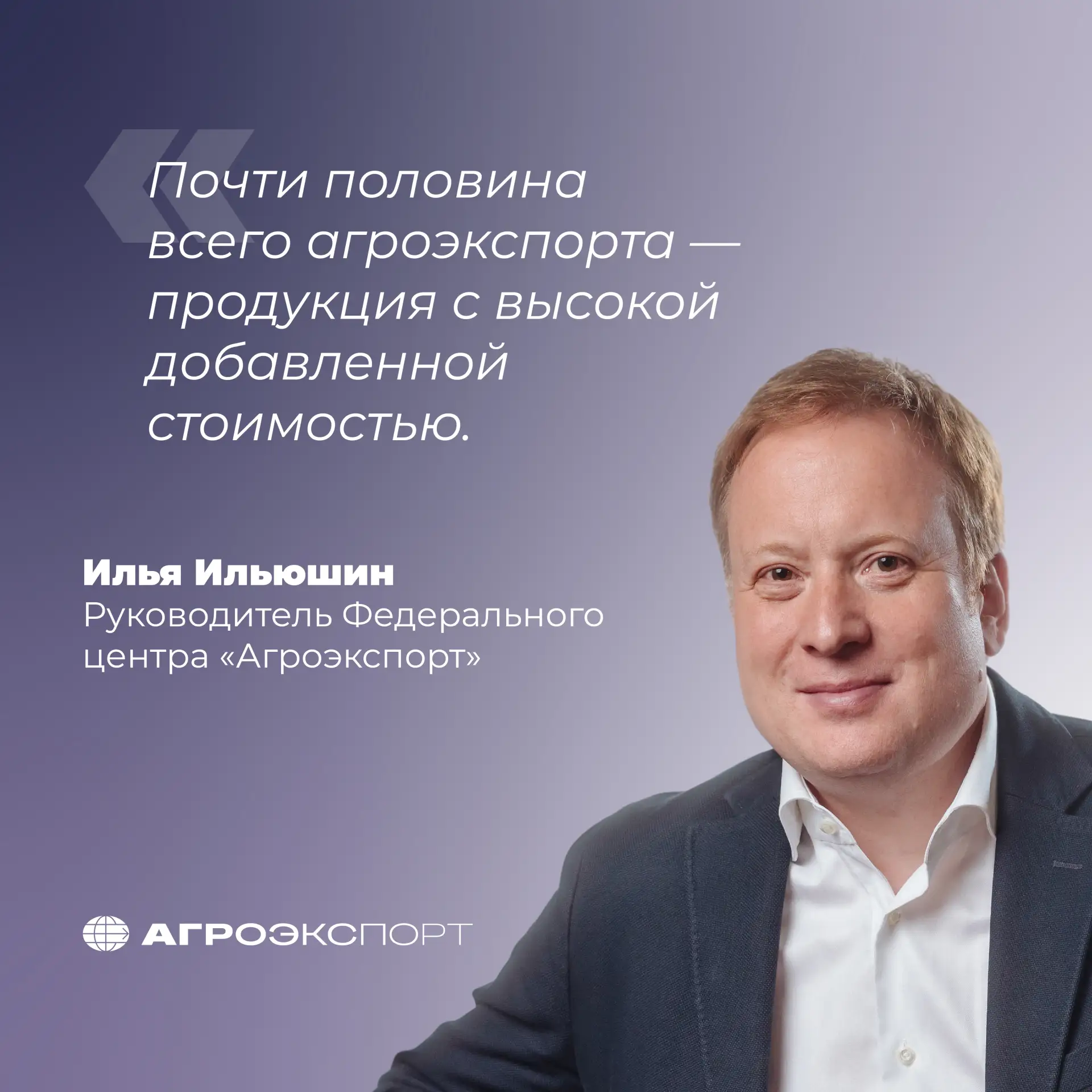 ✔ Глава «Агроэкспорта» Илья Ильюшин: «Делаем ставку на товары с высокой добавленной стоимостью»;