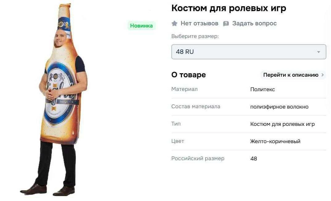 В сети хайпит костюм для ролевых игр в виде бутылки пива. Счастливчики уже делятся приобретением в отзывах
