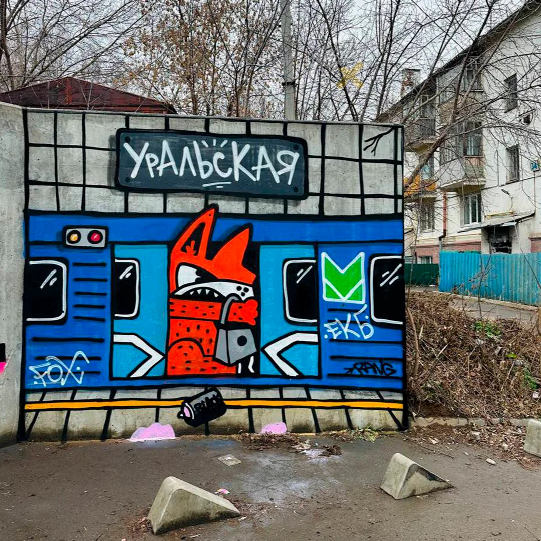 На стене четырёхэтажки на Прониной, 34 теперь красуется работа, которую многие уже приняли за привет с «Уральской». И правда, атмосфера метро считывается мгновенно: красная линия, надписи, вайб подземки… Но сам Витя Fox говорит, что привязки к конкретной станции нет — это отсылка ко всему Екатеринбургу, к его темпу, хаосу, движению.