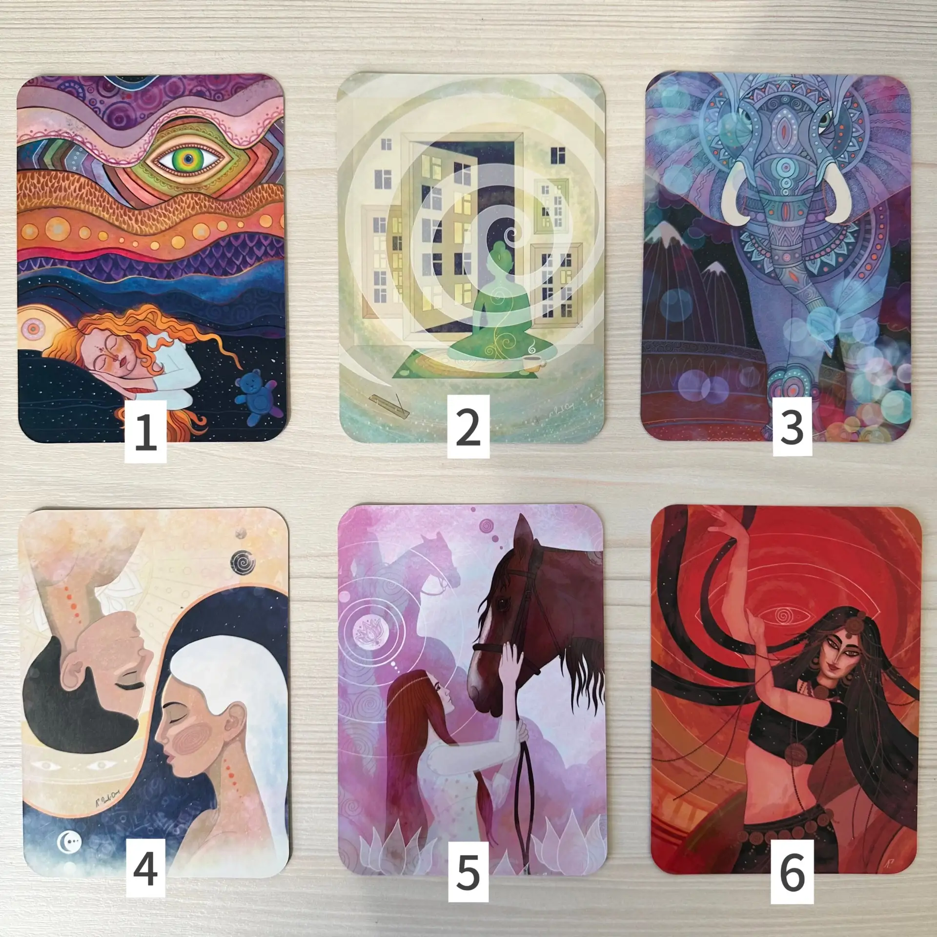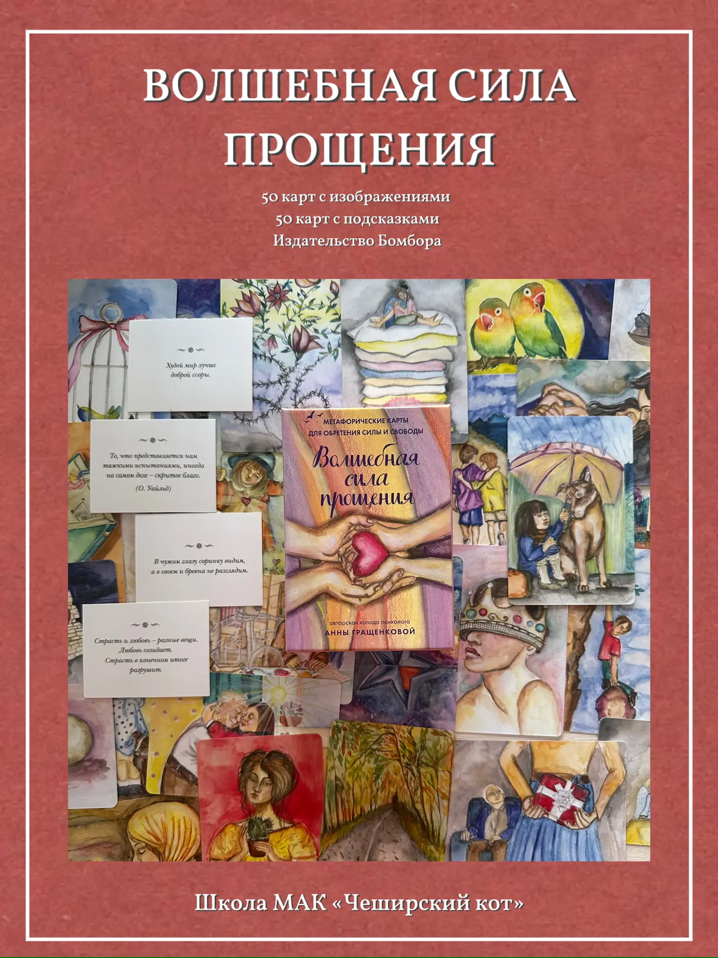 4️⃣ Волшебная сила прощения. Люблю колоды Анны Гращенковой за тепло, исходящее от рисунков, одновременно простых и глубоких. Тема колоды очень важна в отношениях, ну и конечно, сюжеты затрагивают много смежных тем. В качестве подсказок - текстовые карточки с мудрыми цитатами об отношениях и прощении.