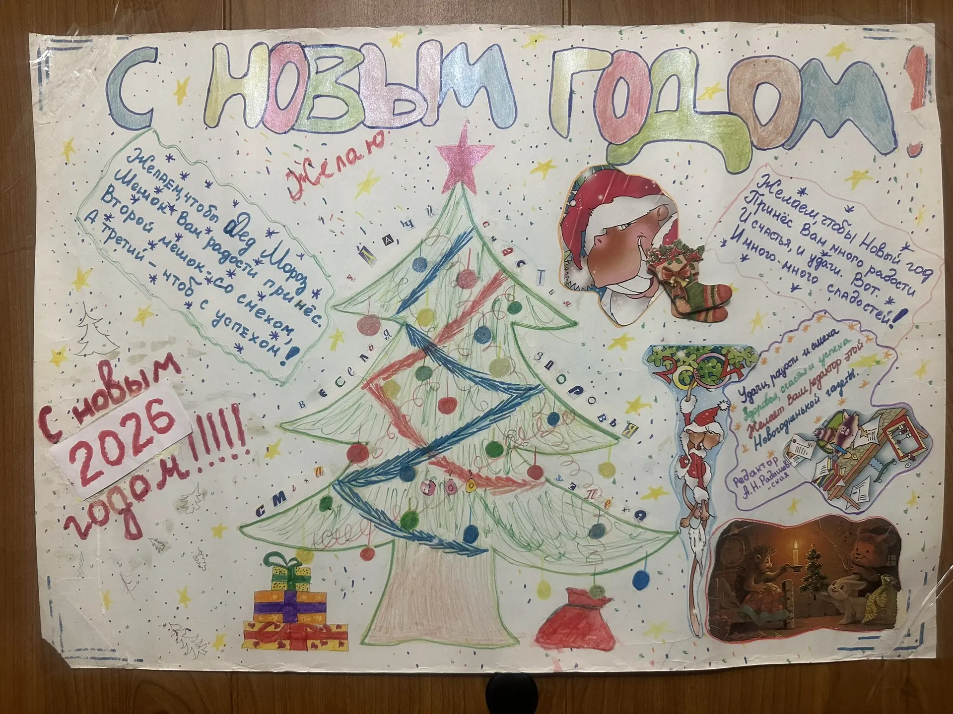 Вот эту стенгазету я сделала, когда мне было 13 лет. Просто для украшения дома и поздравления родных. Сама сочинила стихи, нарисовала елочку, вырезала картинки и буквы (на ветвях елочки пожелания из этих букв).