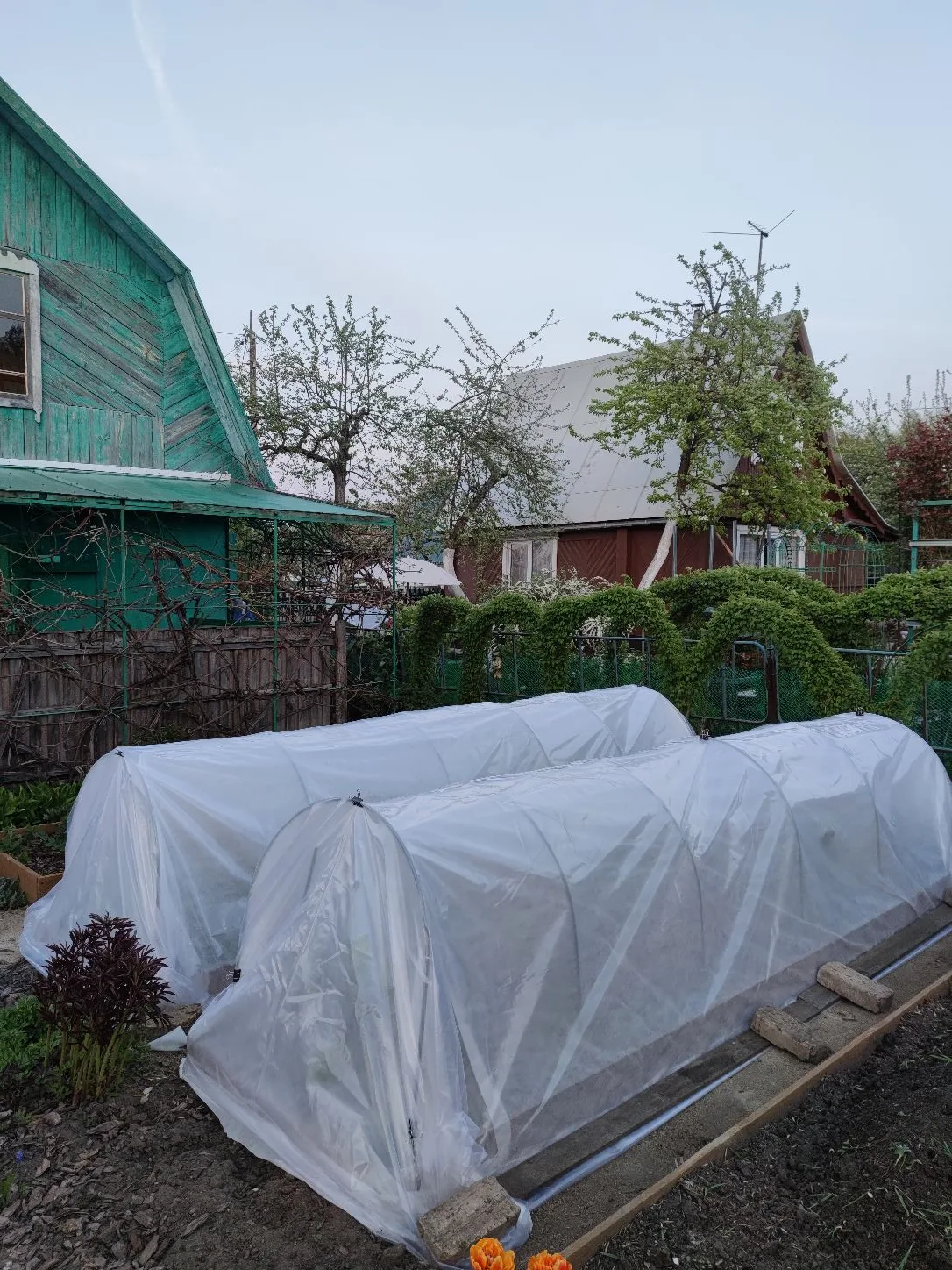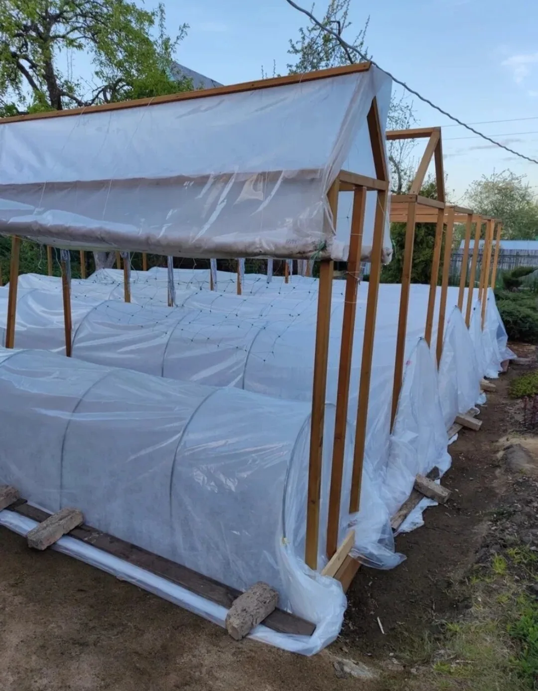 Ставим парнички - дуги, натягиваем укрывной и пленку.