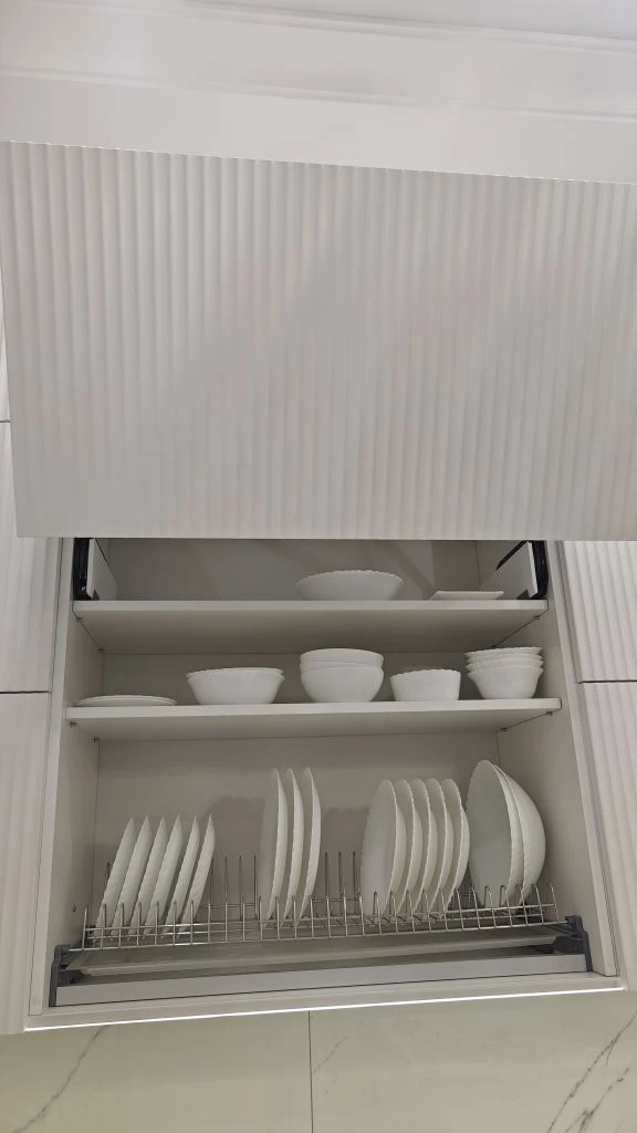 Добавили полочки в отсеке, где вытяжка и тарелки.