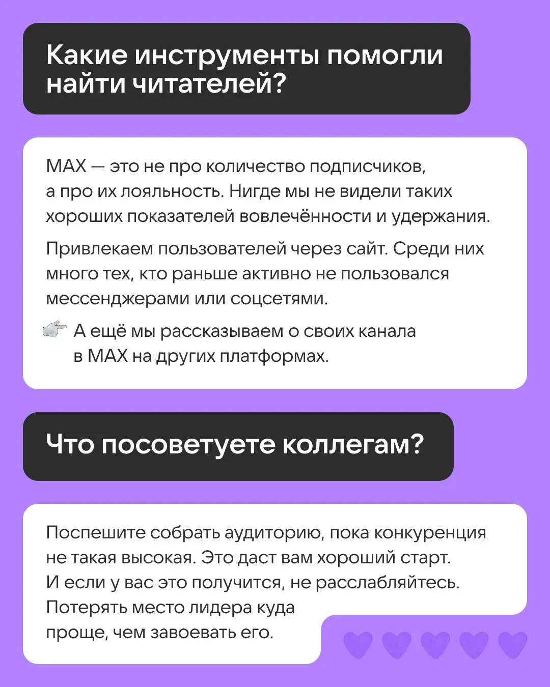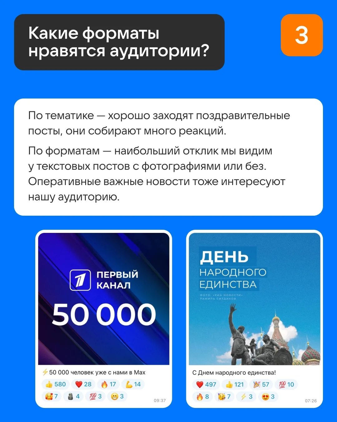 В карточках ответы Анастасии Тургиевой, начальника отдела медиапроектов РИА Новости. Она объяснила, в чём ключ к успеху в MAX и какие форматы нравятся читателям.