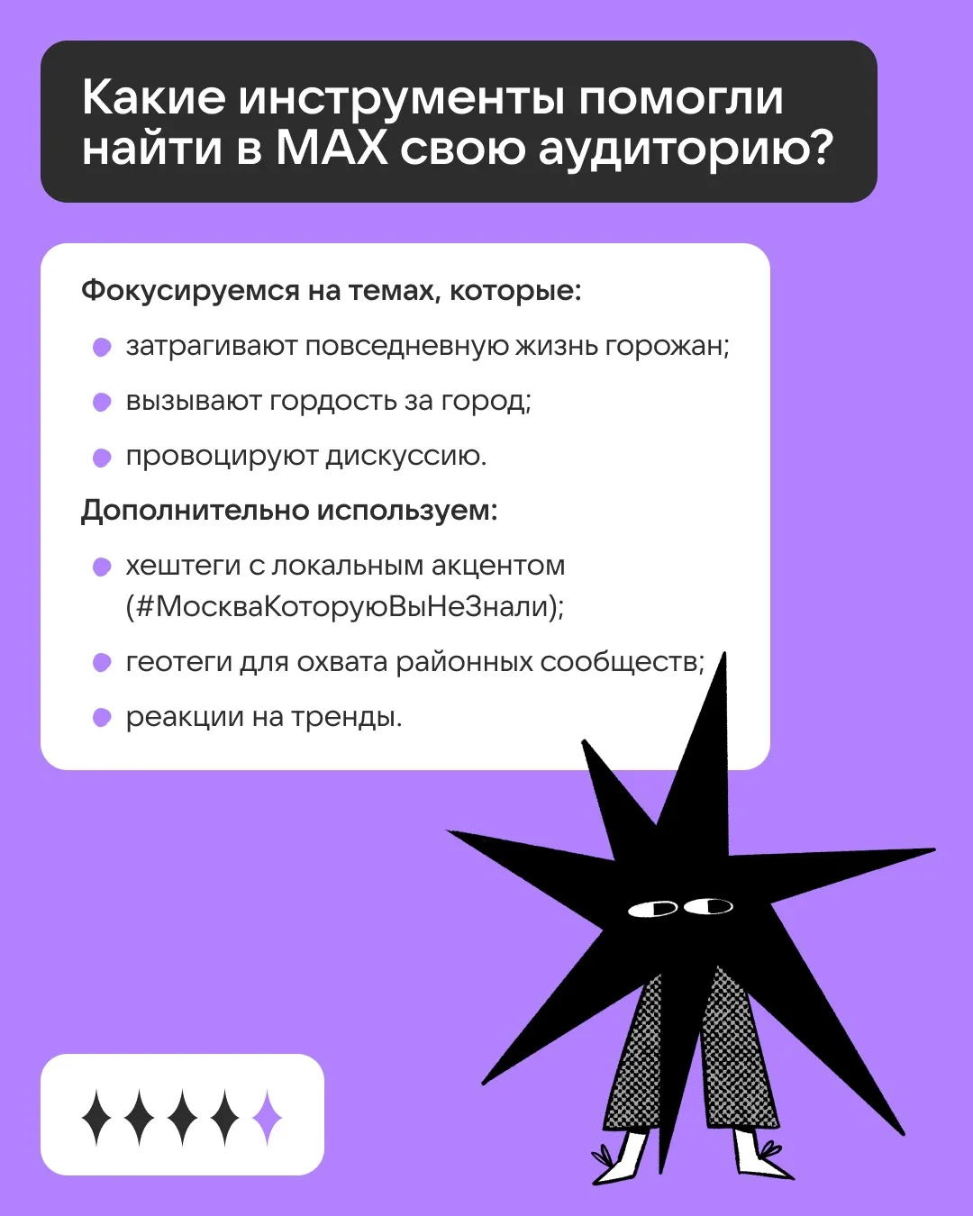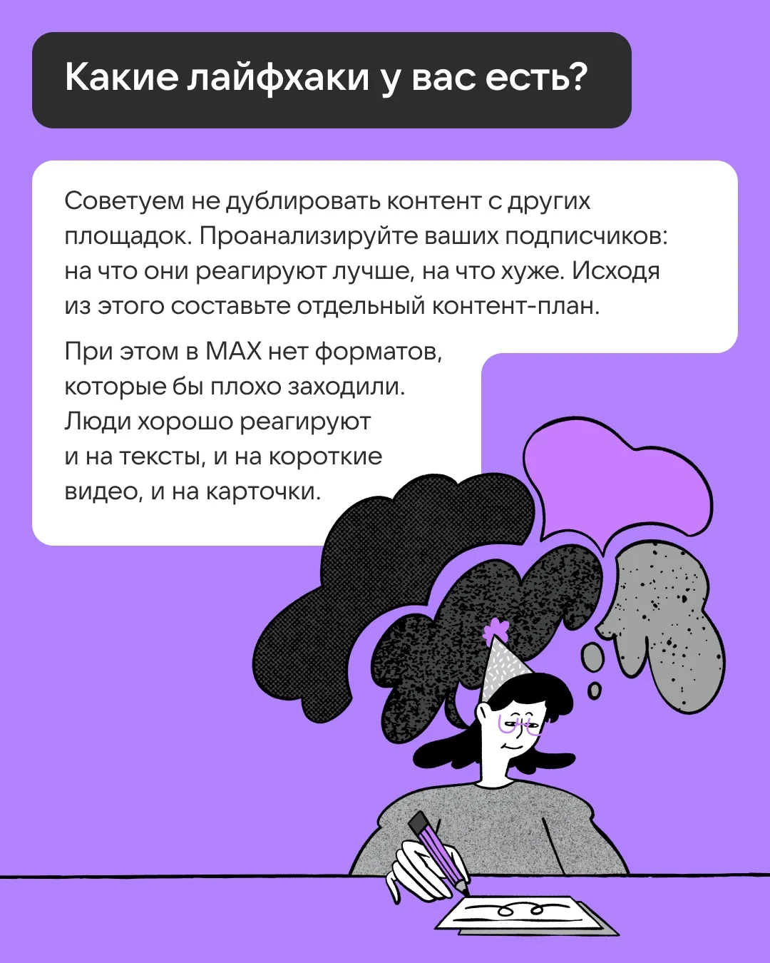 Листайте карточки, чтобы узнать, какие форматы хорошо работают в MAX и какие темы любит аудитория.
