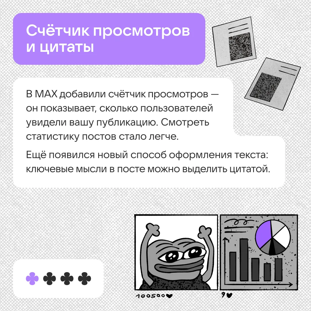 Запускаем новую рубрику — дайджесты новостей МАХ. Каждый месяц будем рассказывать, какие фичи для медийщиков появились и что важного происходит в мессенджере прямо сейчас.
