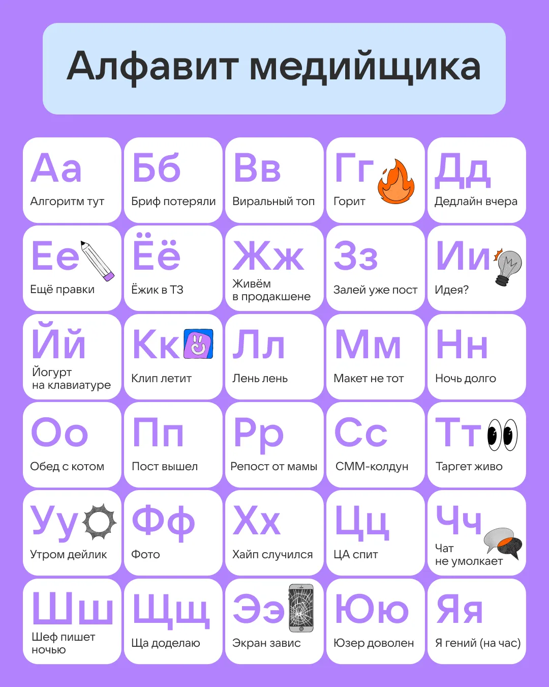 Запрыгнули в тренд и спросили у нейросети, как выглядел бы алфавит медийщика. Нам особенно понравились буквы «С» и «Я», а вам? 😁