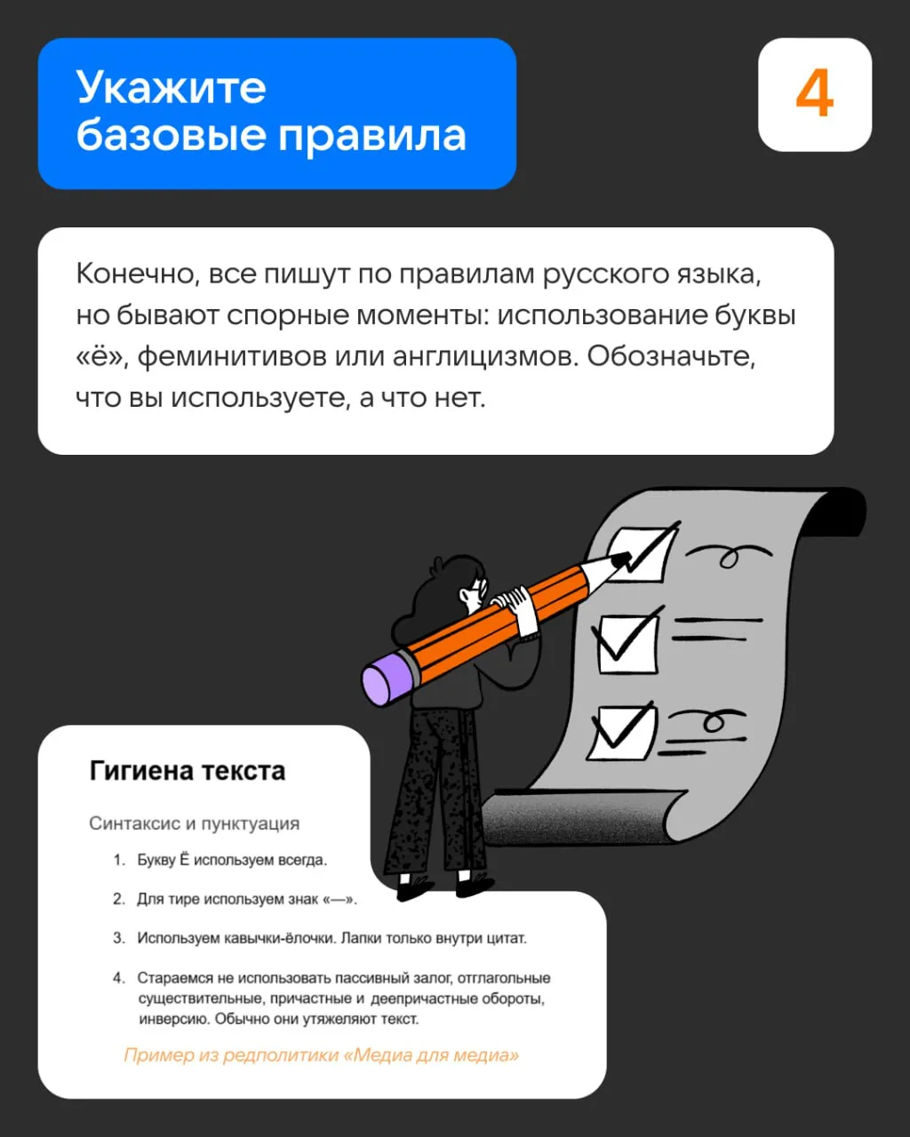 Редакционная политика — главный документ для любого медийщика, который работает с текстами. В ней собраны ответы на все философские вопросы: кто вы, как пишете, кто вас читает?