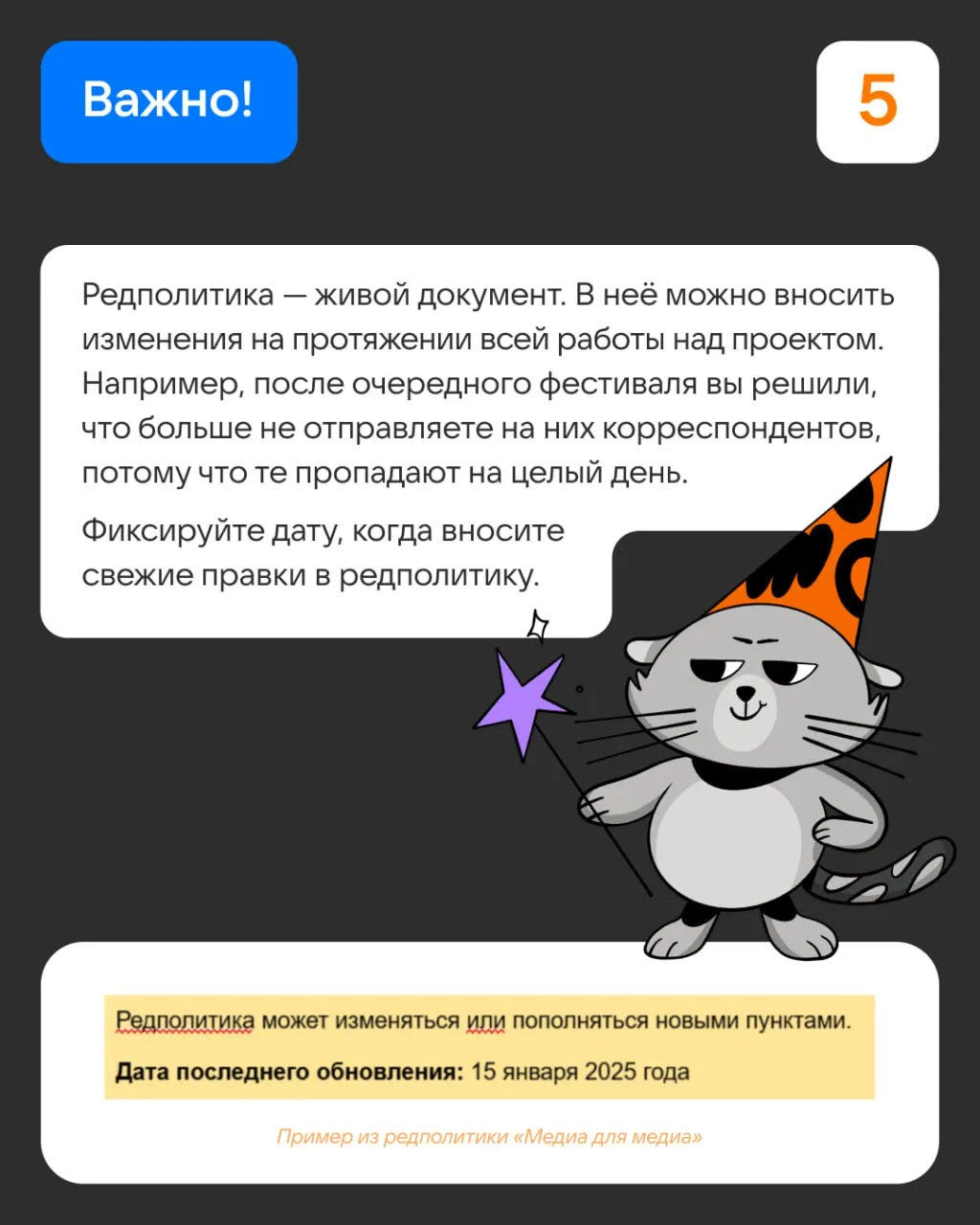 В карточках напоминаем, как составить редполитику. Пригодится, если раньше работали без неё или начинаете проект с нуля.