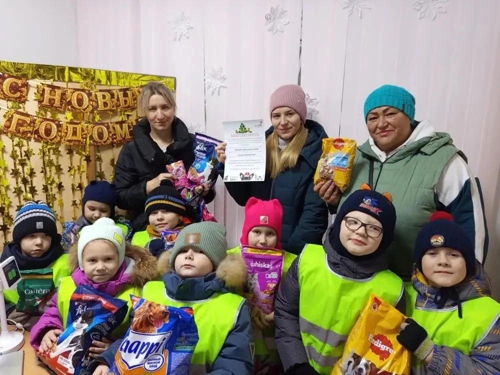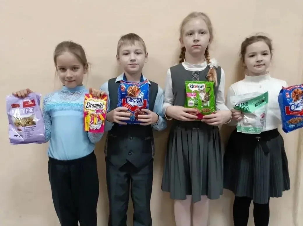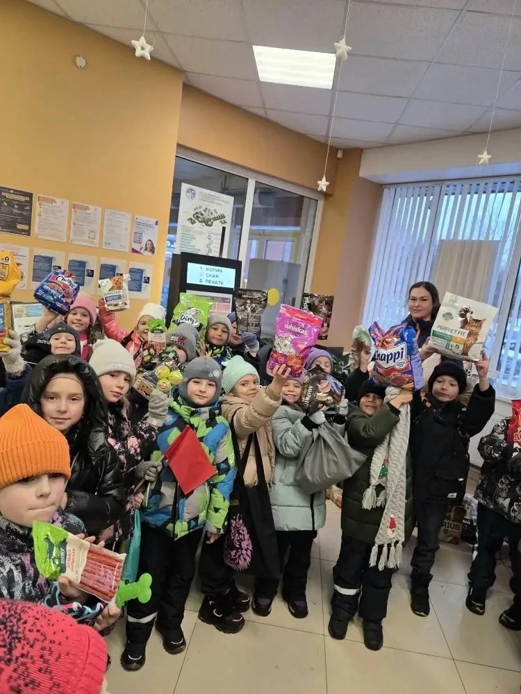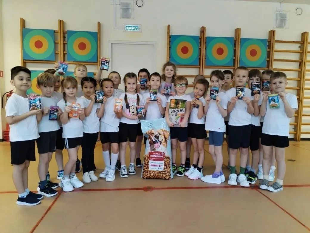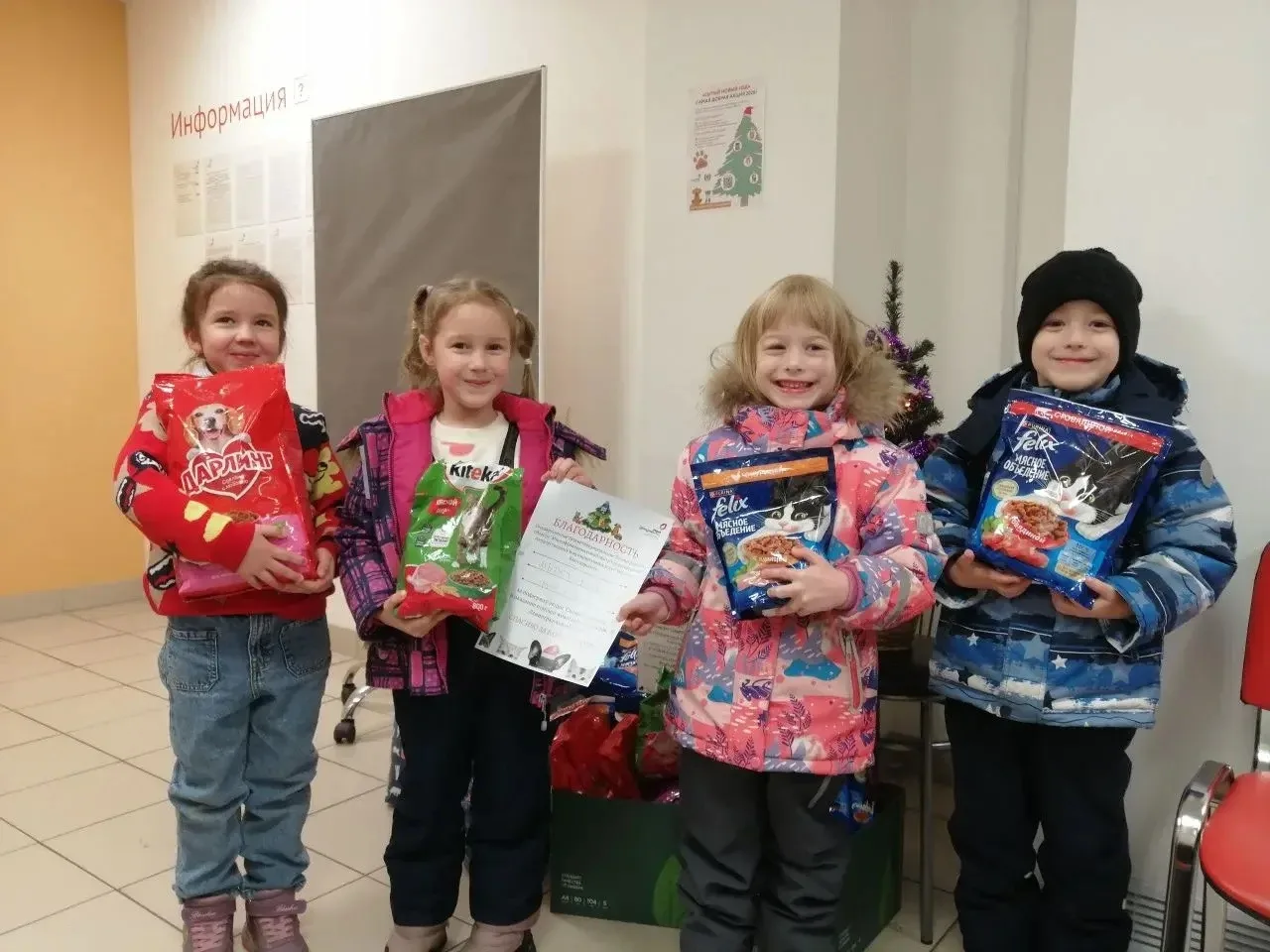 Ребята пришли не с пустыми руками - они принесли корм для пушистых хвостиков, который мы потом передадим в приют для животных.