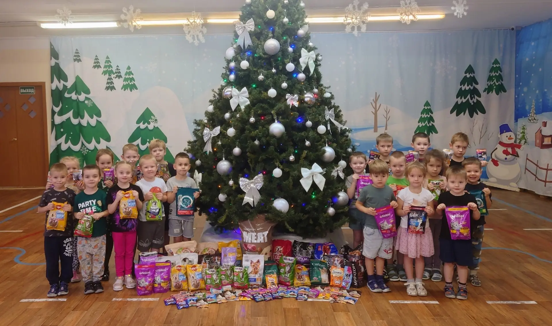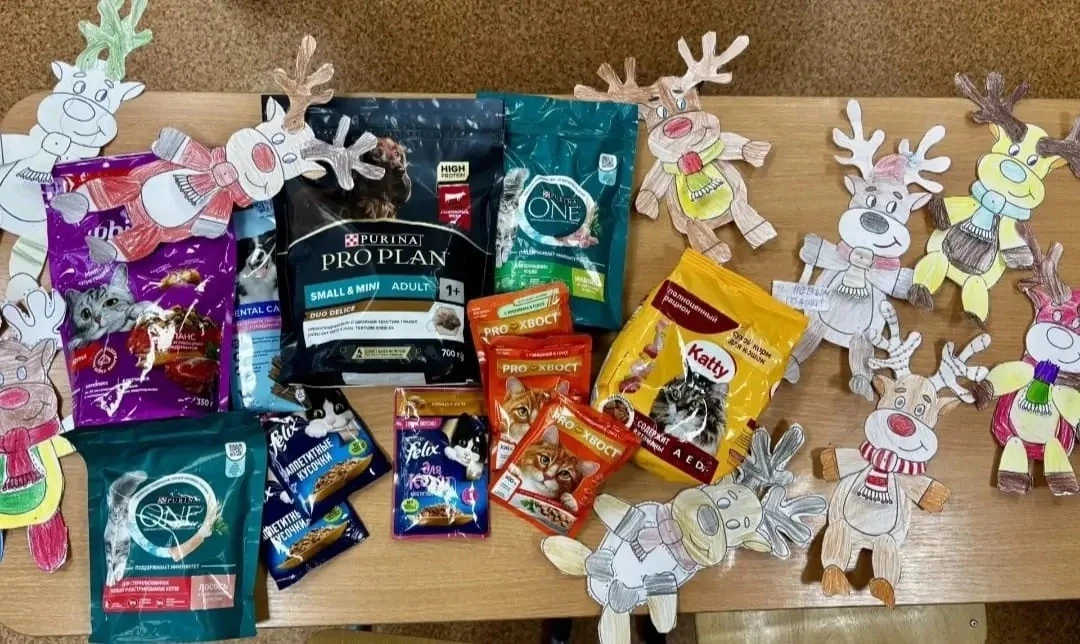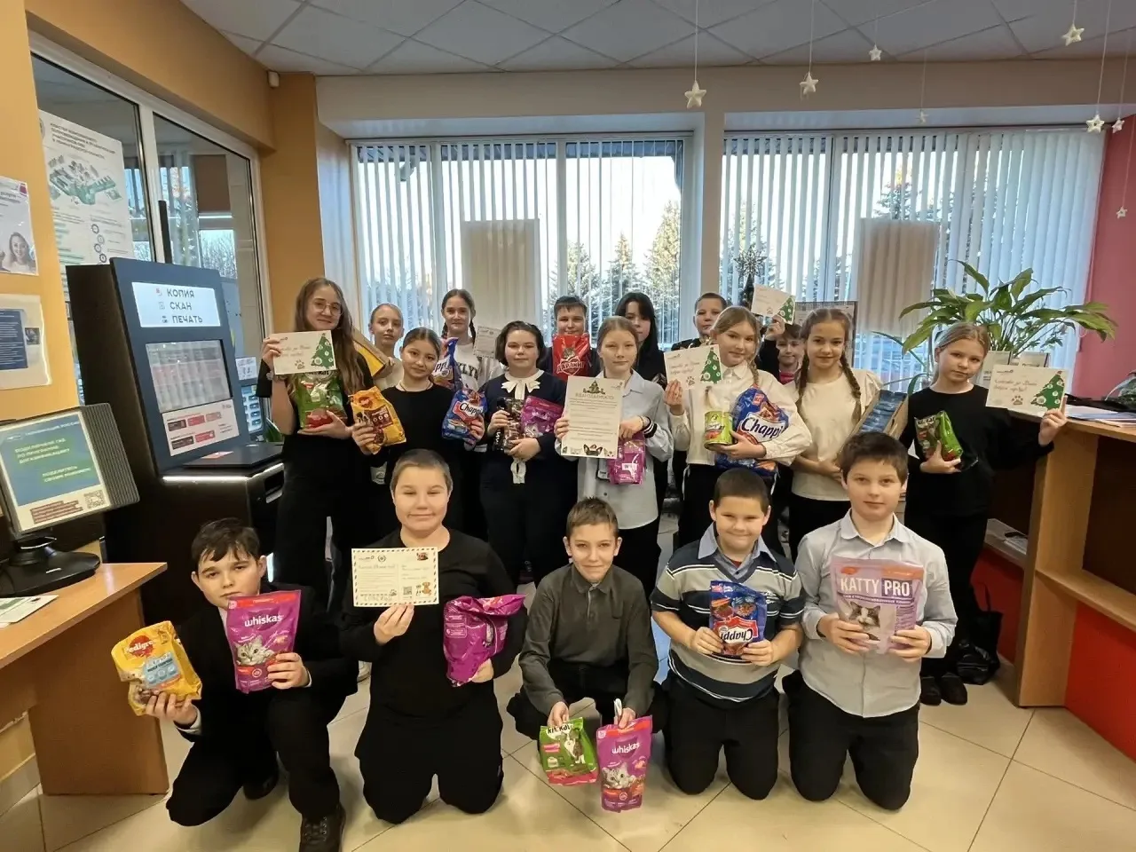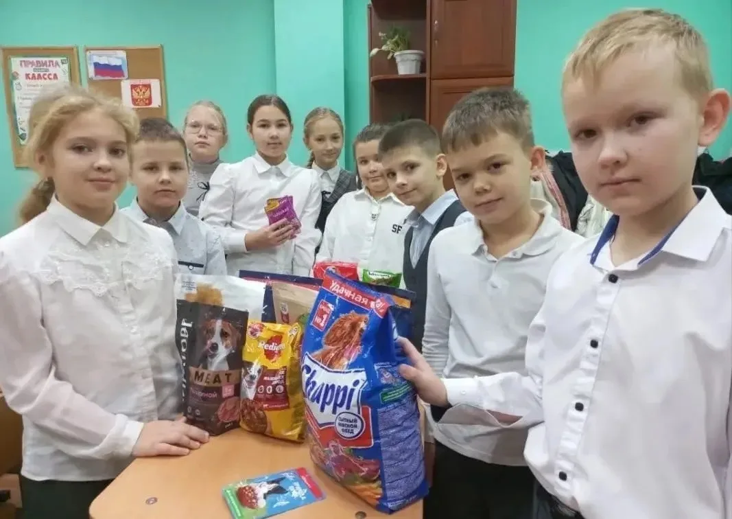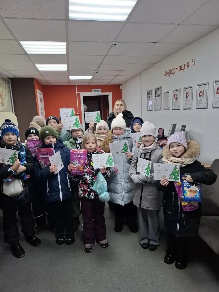 Ребята пришли не с пустыми руками - они принесли корм для пушистых хвостиков, который мы потом передадим в приют для животных.