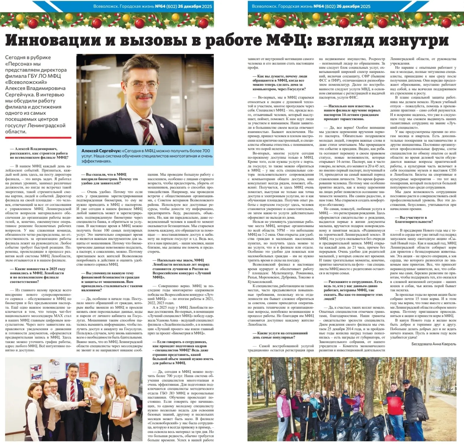 В рубрике «Персона» популярной газеты «Всеволожск. Городская жизнь» вышло развернутое интервью с Алексеем Сергейчуком - директором филиала МФЦ Всеволожский.