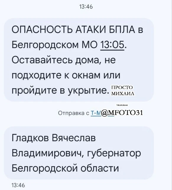 ОПАСНОСТЬ АТАКИ БПЛА в Белгородском МО 12:02. Оставайтесь дома, не подходите к окнам или пройдите в укрытие.