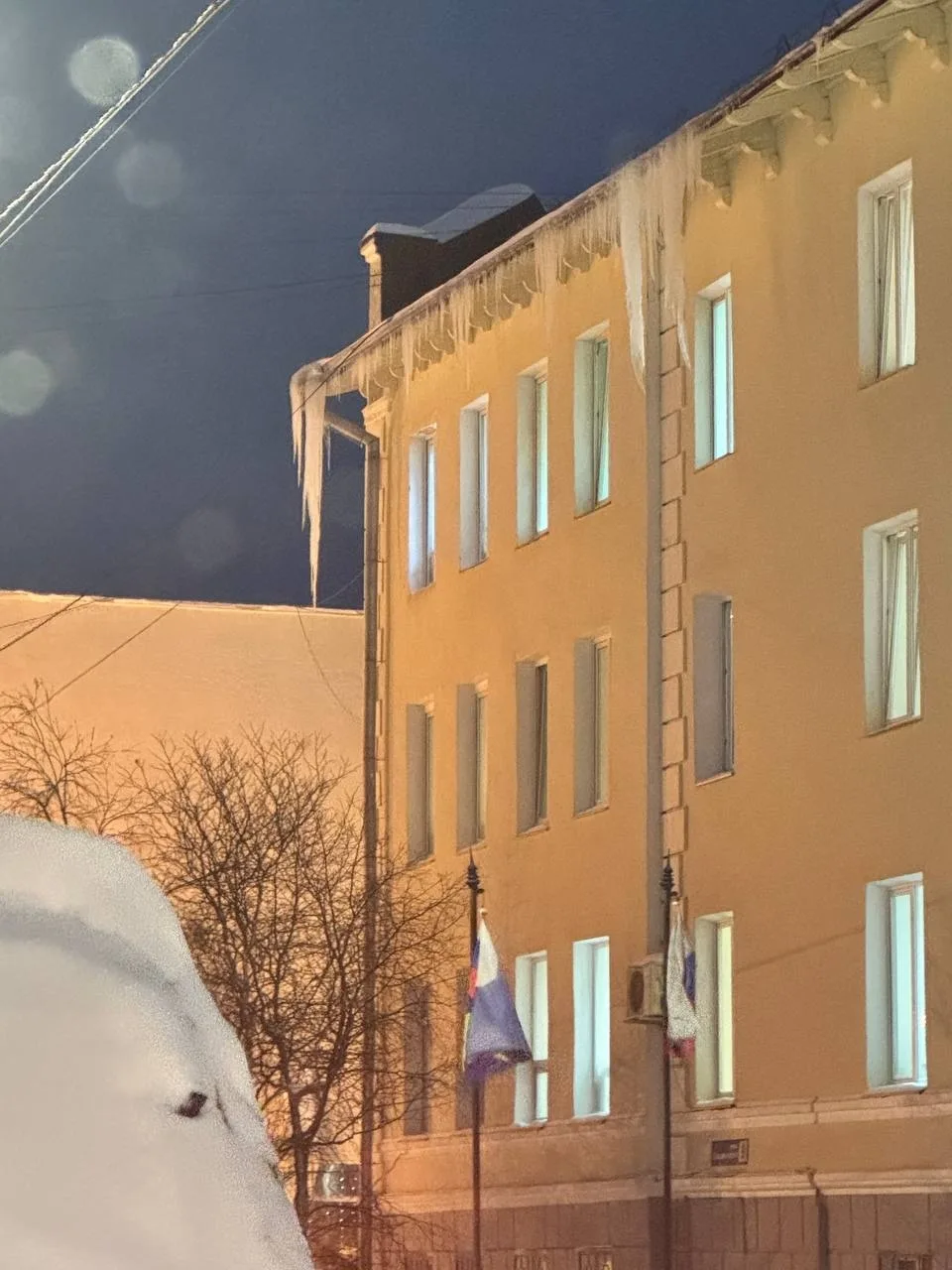 Добрый день. Огромные сосульки над детской поликлиникой 2 по ул. Наровчатова