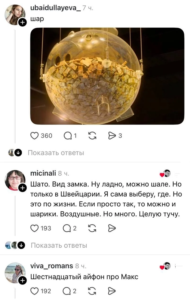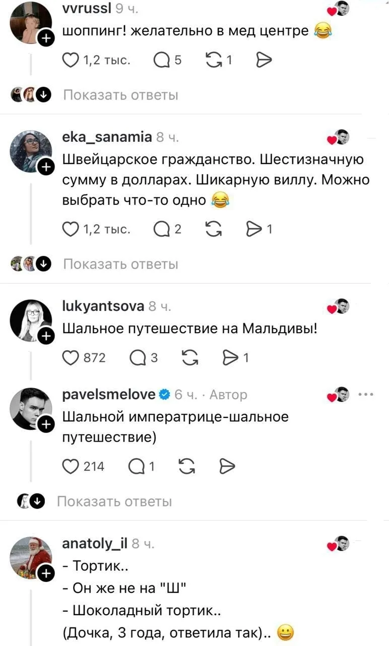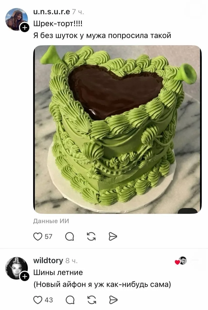 Девушки не растерялись: Шаман вживую, Шрек-торт и шоппинг… в медцентре! Комментарии взорвались: от классики (шампанское, шмотки) до полного абсурда. Теперь парни в панике — выбрать подарок стало нереально.