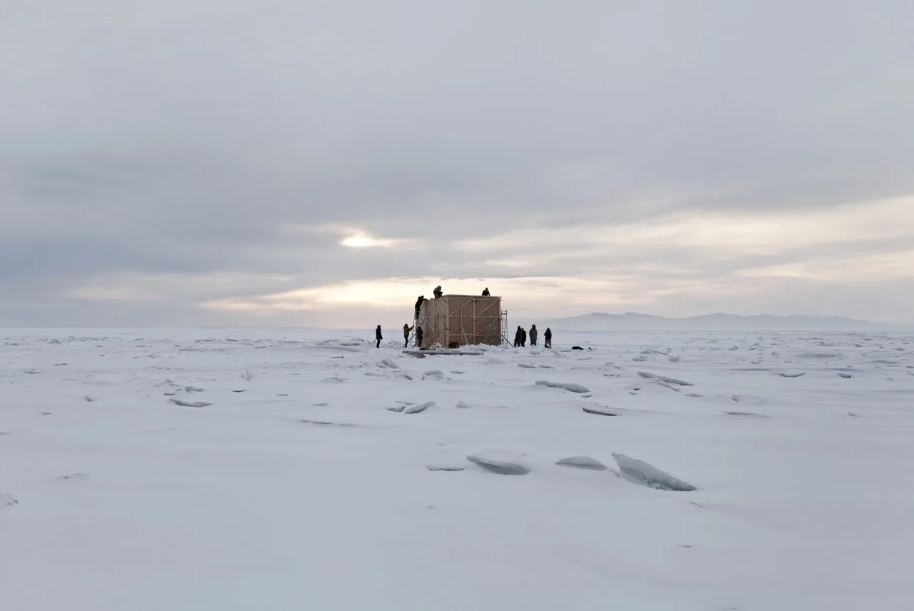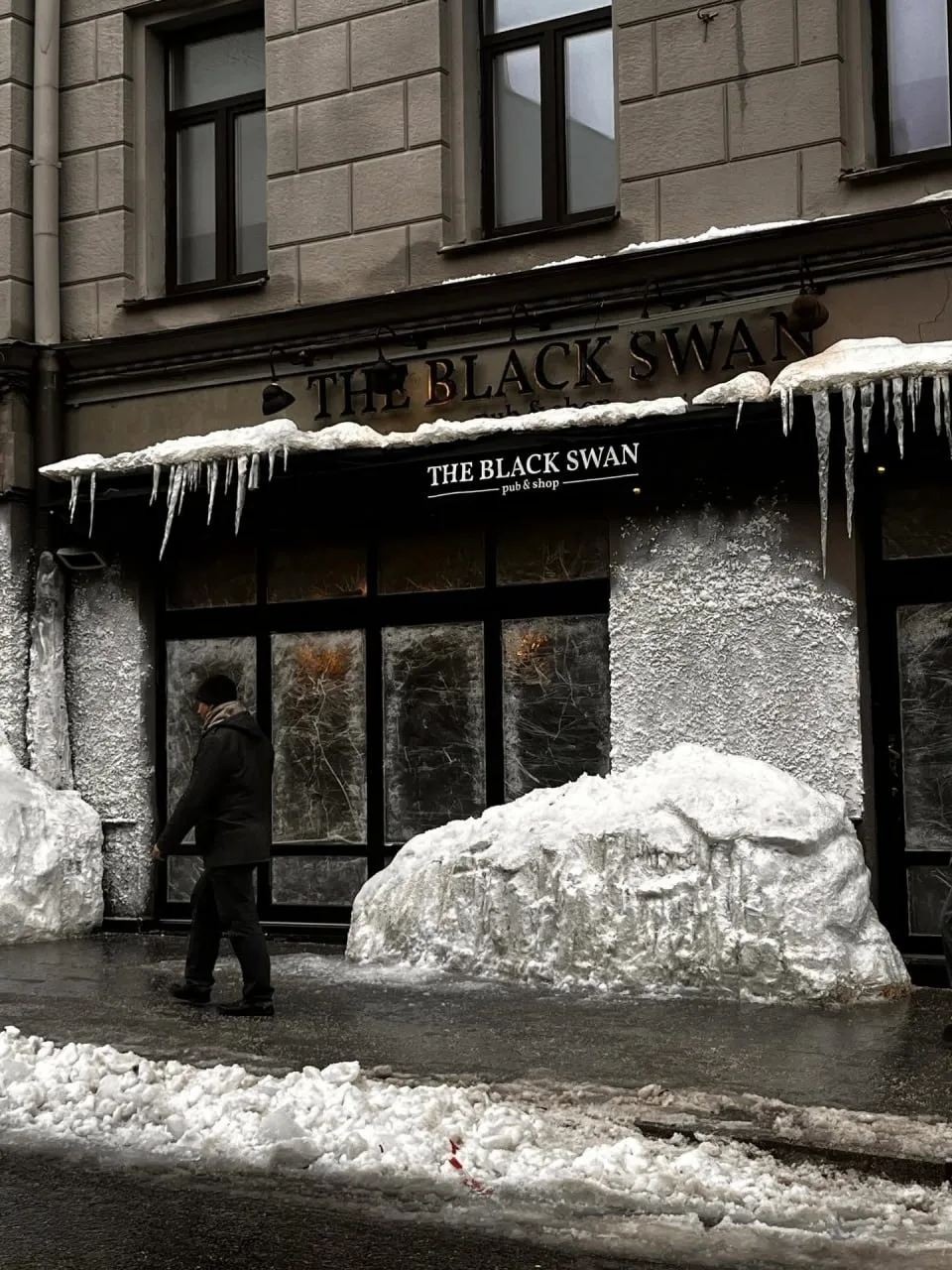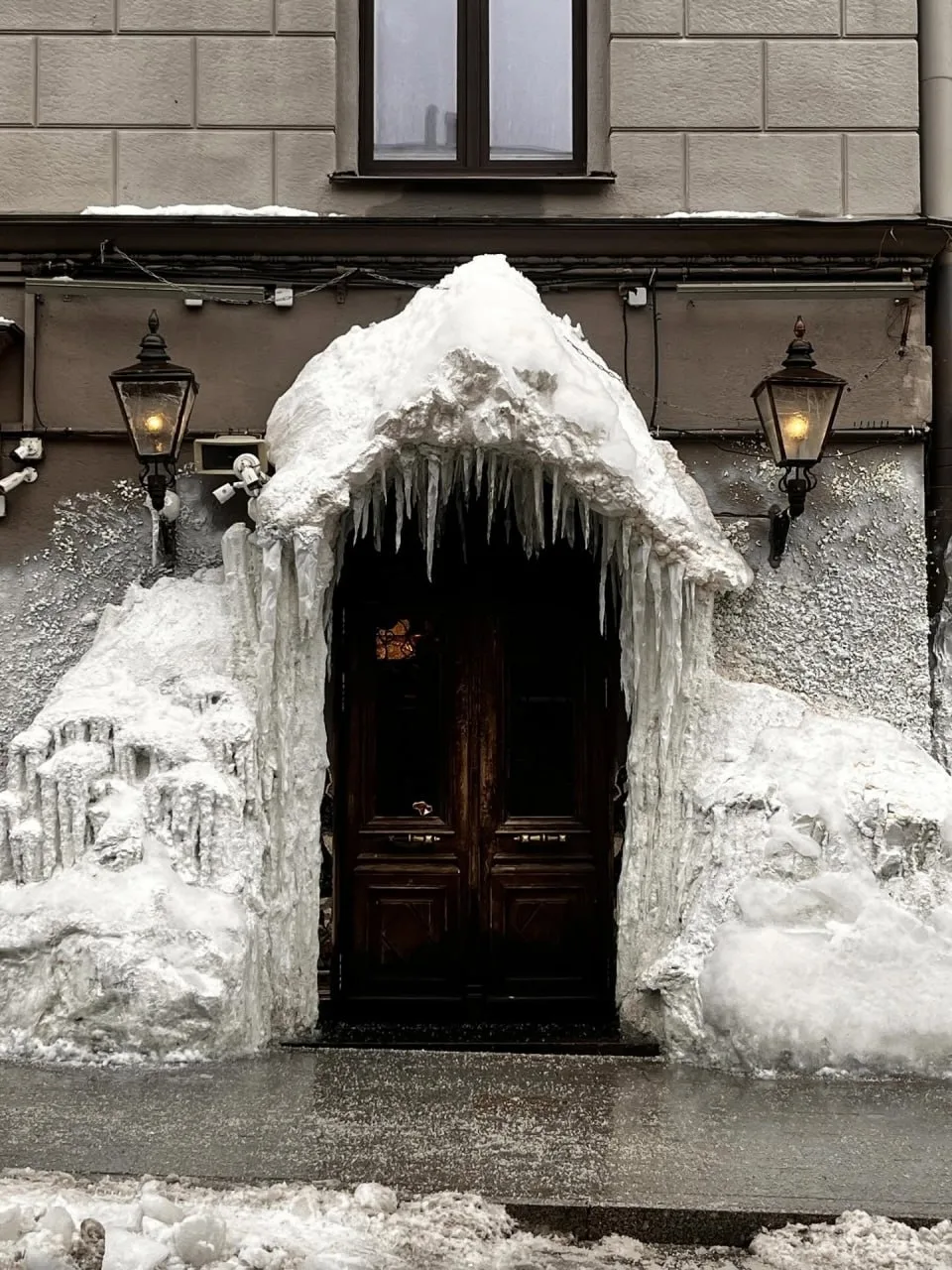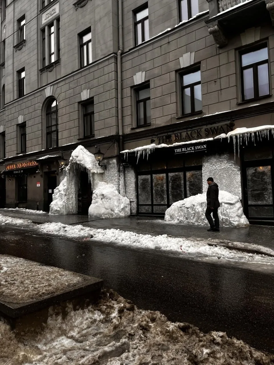 Московский бар оригинально обыграл мартовскую погоду: вход украсили… серым снегом и гигантскими сосульками, нависающими над дверью.
