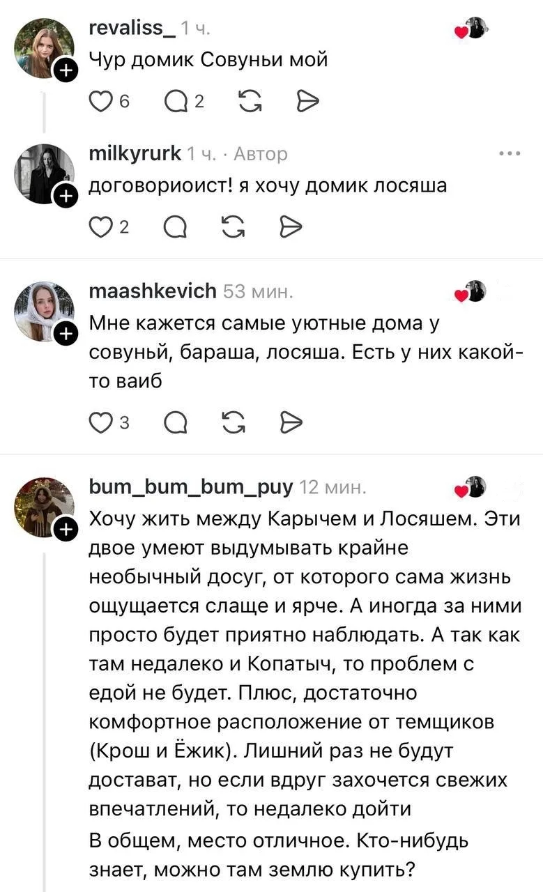 Домики Совуньи, Бараша и Лосяша назвали самыми уютными, каждый по‑своему: у Совуньи — мудрая тишина и полки с книгами, у Бараша — творческое вдохновение в каждом уголке, а у Лосяша — научные открытия и интересные книги. А комфортнее всего жить между Карычем и Лосяшем, потому что они всегда придумывают интересный досуг: то шахматный турнир устроят, то научат наблюдать за звёздами.