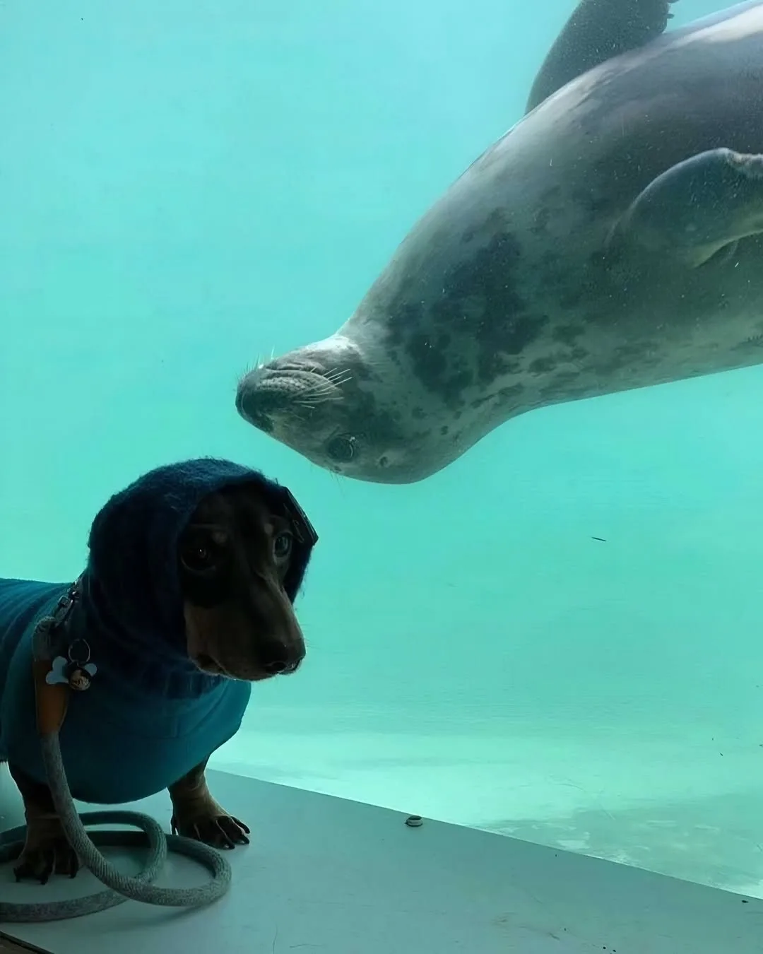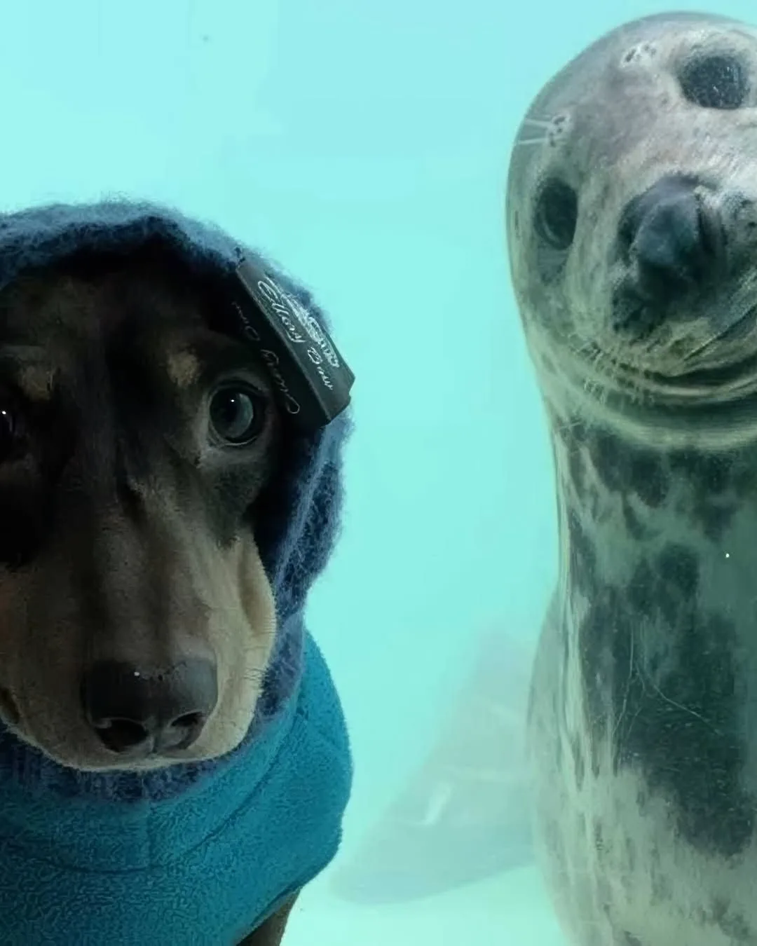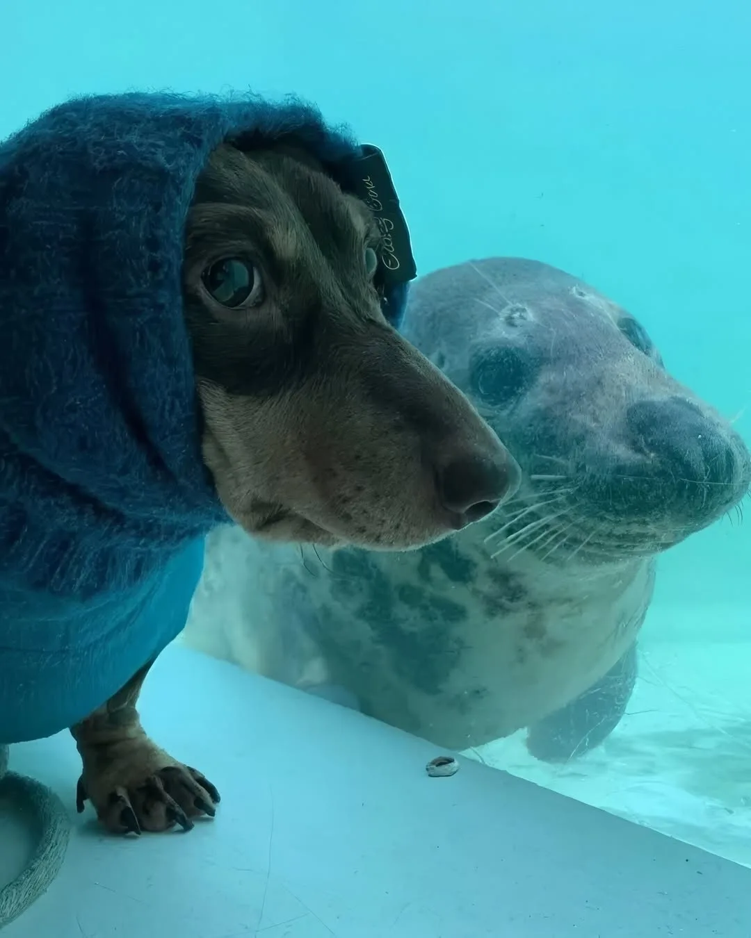 Такса по кличке Стэнли познакомилась с Айлой — спасённым тюленем.