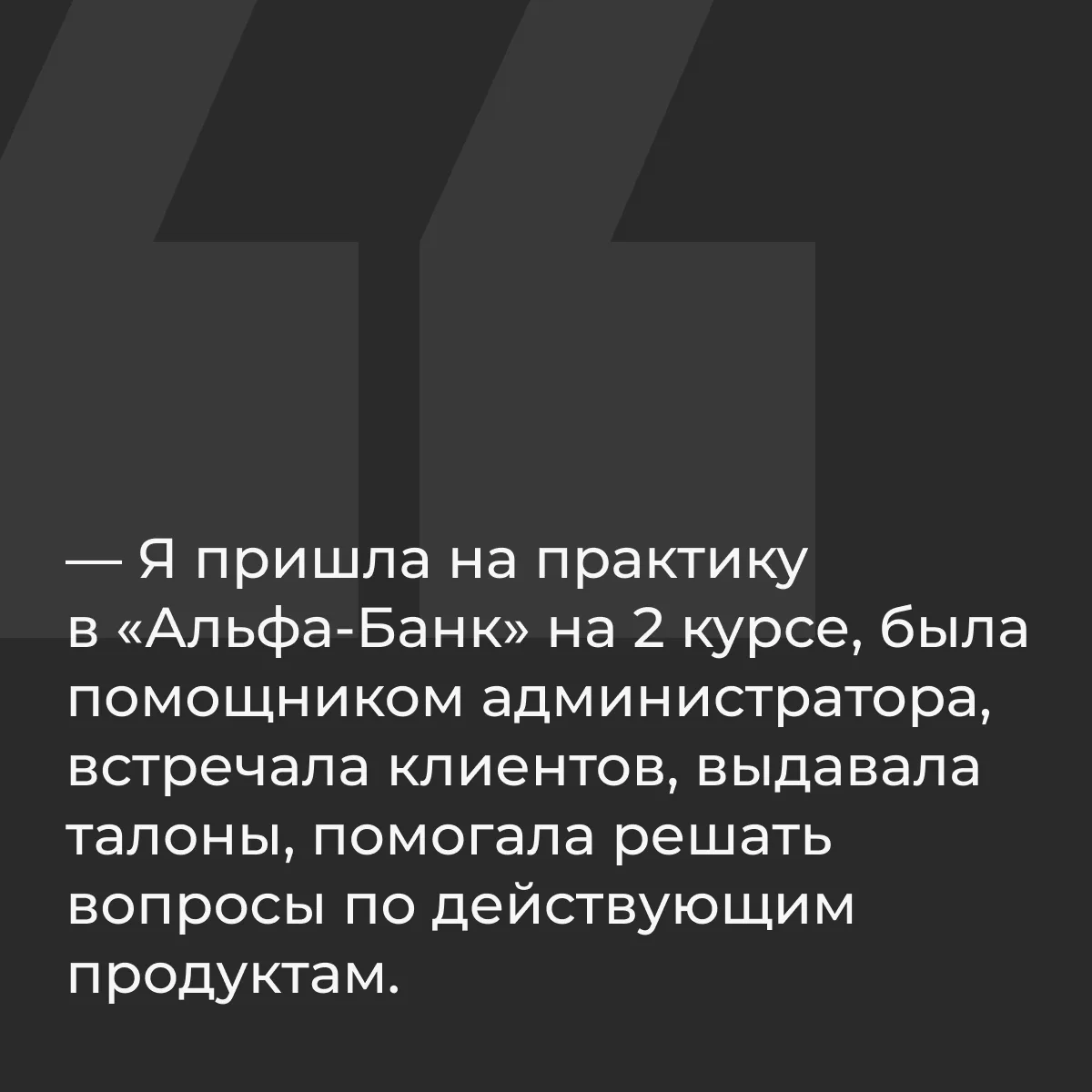 Полина Алексеева – выпускница колледжа по специальности «Банковское дело», а сейчас она учится на 2 курсе очно‑заочного обучения по направлению «Управление персоналом» и одновременно работает главным менеджером розничного бизнеса в «Альфа‑Банке». И вот её путь к успеху! — Мой путь начался со второй практики. Я пришла в банк помощником администратора: встречала клиентов, выдавала талоны, помогала разбираться в действующих продуктах. На следующий год, перед дипломом, вернулась туда же.