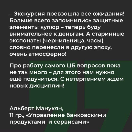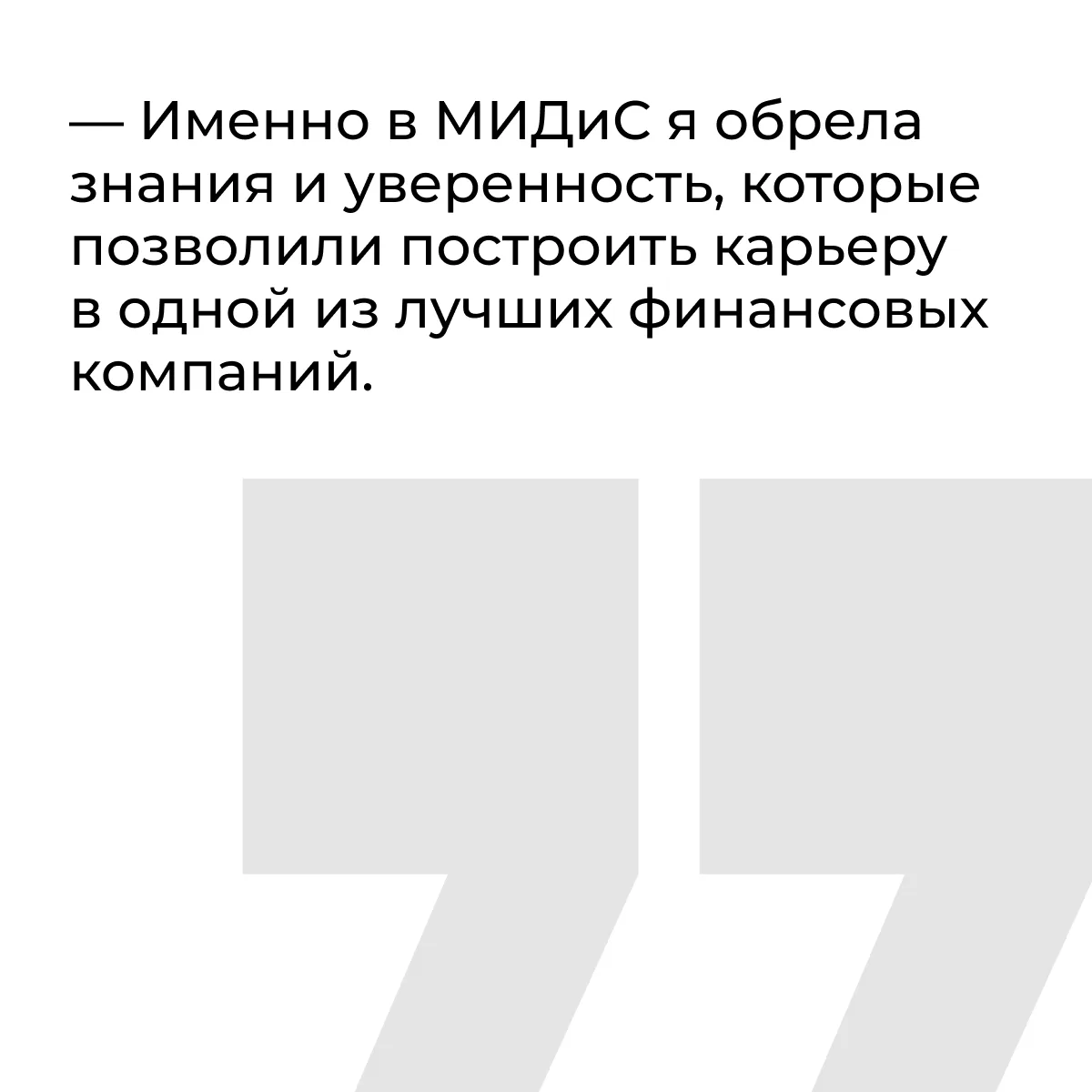 Отдельное спасибо хочу сказать своему куратору Ирине Сергеевне Полушиной и преподавателям кафедры: они не просто читали лекции, а помогали разобраться, поддерживали и верили в нас. МИДиС для меня – это точка роста, с которой начались и профессиональный старт, и личные достижения. Сегодня я часть команды «Альфа‑Банка> и каждый день вижу, как знания, полученные в институте, работают в реальной жизни.