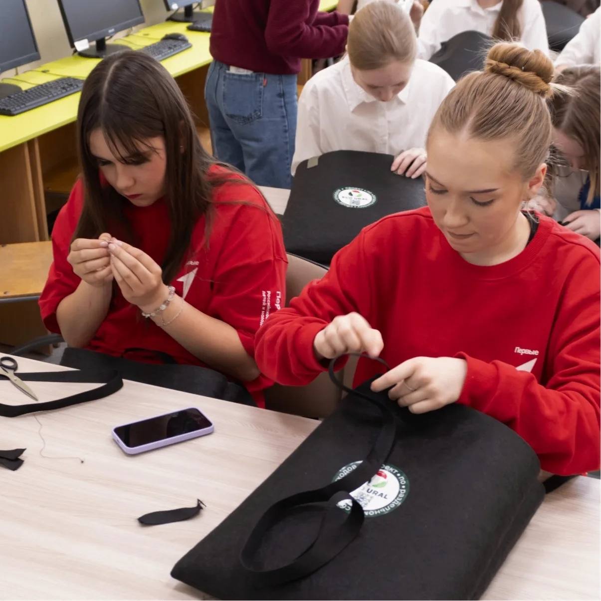 Дальше школьники разошлись по мастер-классам. Туристы собирали авторские эко‑маршруты по России, «модельеры» превращали обычные футболки и нетканое полотно из переработанного пластика в сумки и одежду, графические дизайнеры делали закладки из вторсырья. На анимации участники знакомились с солар-панком и вместе с нейросетями собирали ИИ-видео о будущем планеты. А на интернет‑маркетинге придумывали, как продвигать экологические продукты и рассказывать о них так, чтобы в это верили и выбирали.