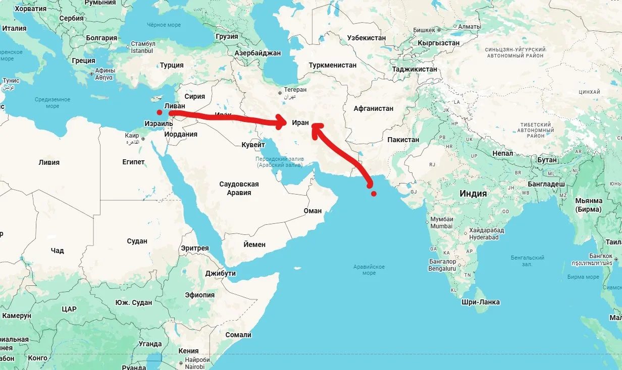 Таким образом, Иран может быть атакован с воздуха одновременно с двух сторон (схема, разумеется, примерная)