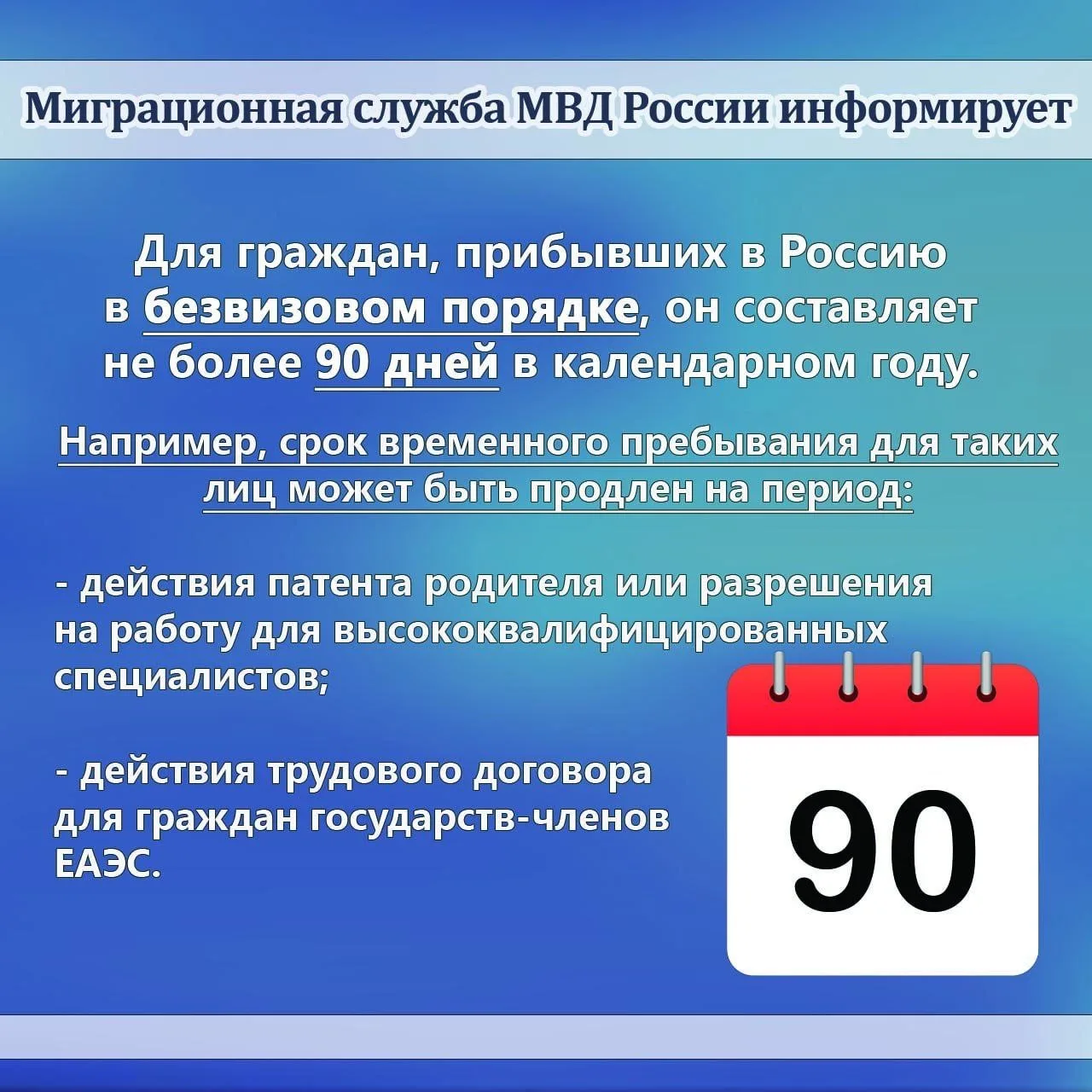 🗓️ Максимальный срок пребывания на территории Российской Федерации иностранных граждан, прибывающих в безвизовом порядке и не имеющих оснований для продления срока пребывания, составляет не более 90 дней в календарном году.