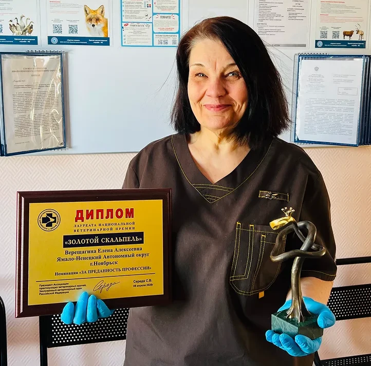 Она стала лауреатом премии «Золотой скальпель» в номинации «За преданность профессии». Это высшая и самая престижная награда для практикующих ветврачей. Торжественное награждение прошло в Москве. К слову, Елена — первая, кто её получил на Ямале. Своей профессии она посвятила уже 40 лет.