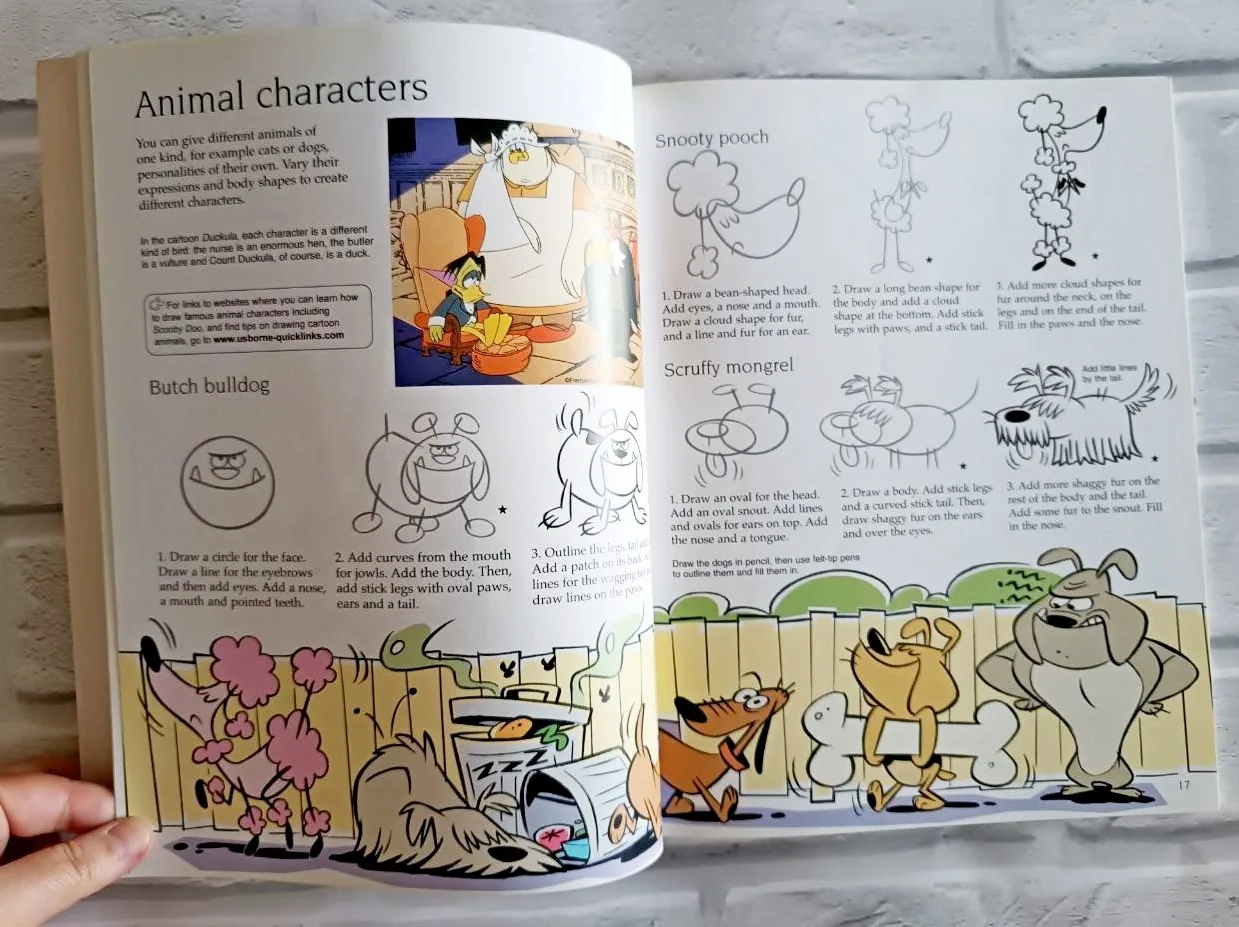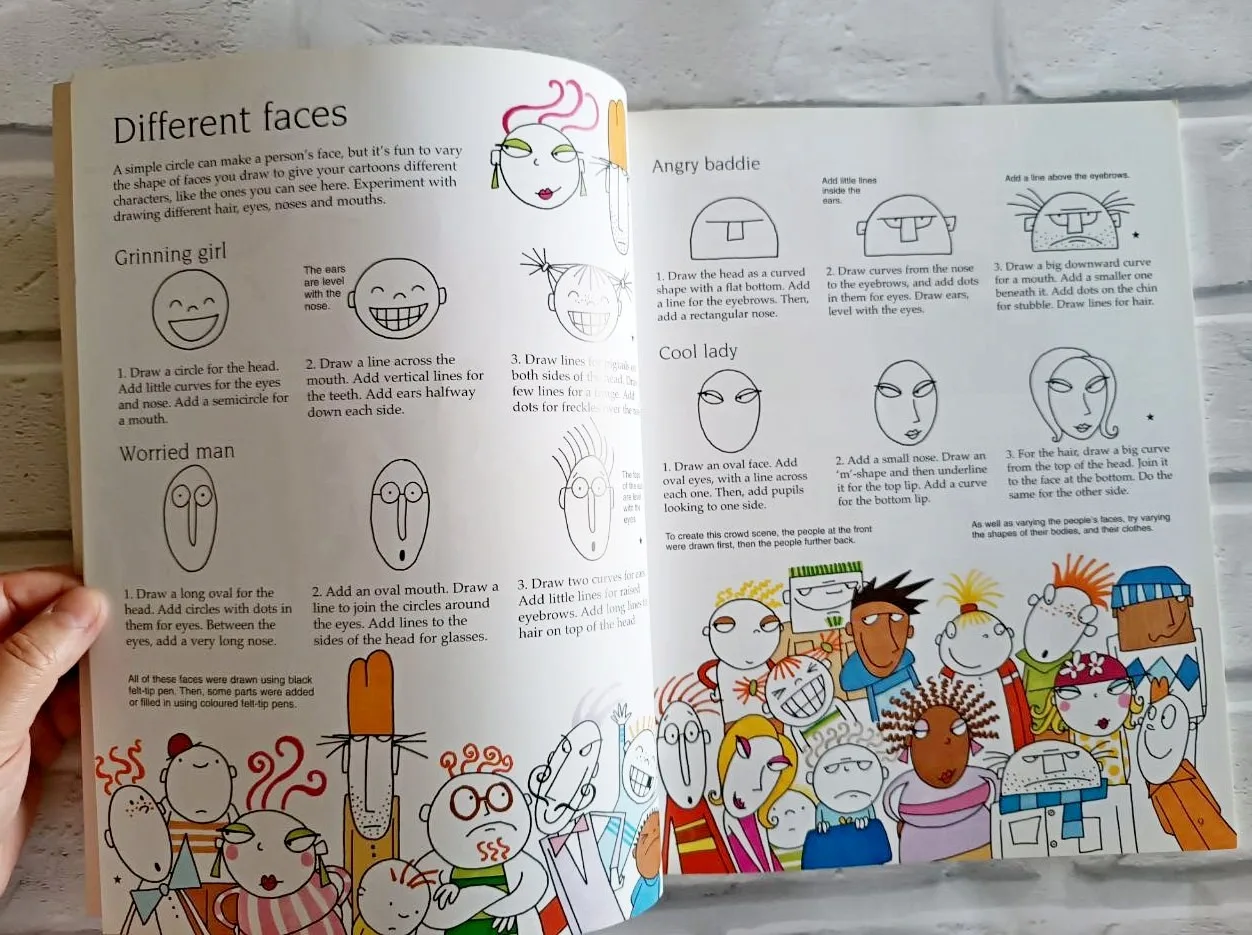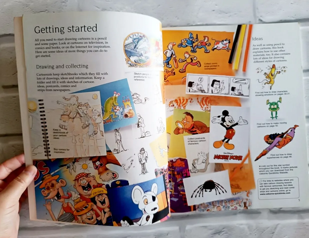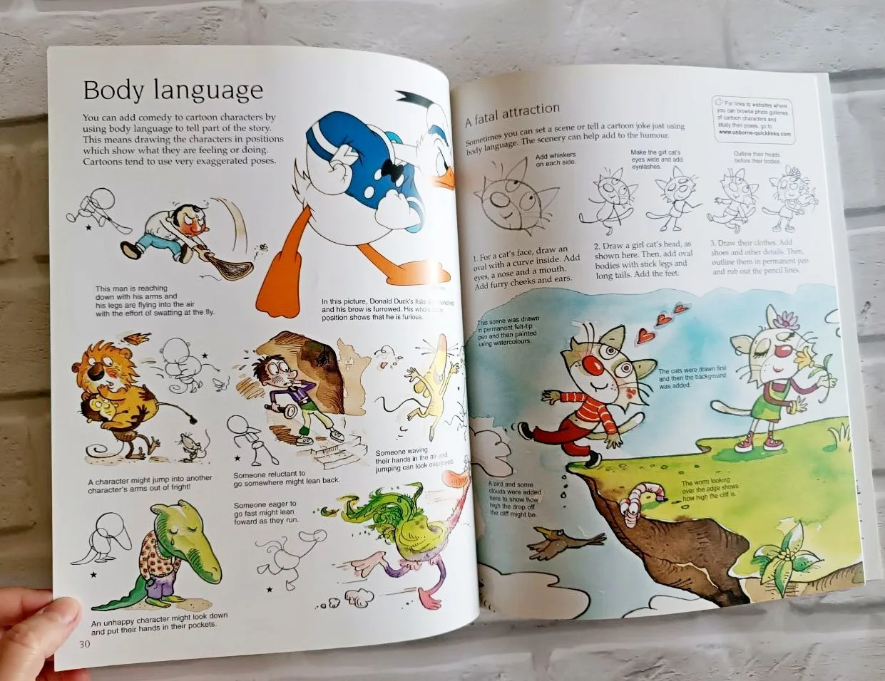 «Drawing Cartoons» от легендарного британского издательства Usborne — это не скучный учебник, а настоящий тренажер креативности. Анна Милбурн создала гид, который берет за руку и ведет в мир, где вы — главный режиссер. От забавных гримас и эмоций до полноценных экшн-сцен с животными и супергероями. 🦸♂️🐾