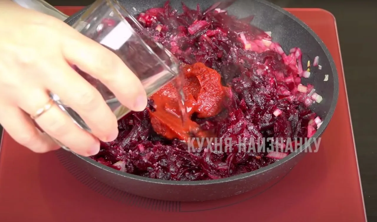 Через пару минут добавляю натёртую на крупной тёрке свёклу, томатную пасту, соль по вкусу, немного чёрного перца и 100 мл любого рассола (это моя вторая хитрость). Конечно, можно добавить воду, но с рассолом вкуснее.