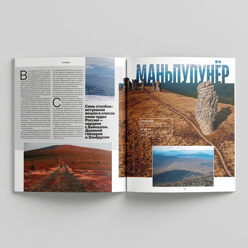 Мы составили гид по нашей стране — и выбирали места, которые не так часто ложатся на маршрут путешественника (как, скажем, Петербург или Сочи). Так в программе появились инопланетные пейзажи плато Путорана, окаменевшие великаны Маньпупунёра или гостевые дома в Мурманской области, через стеклянные крыши которых видно невероятное северное сияние.