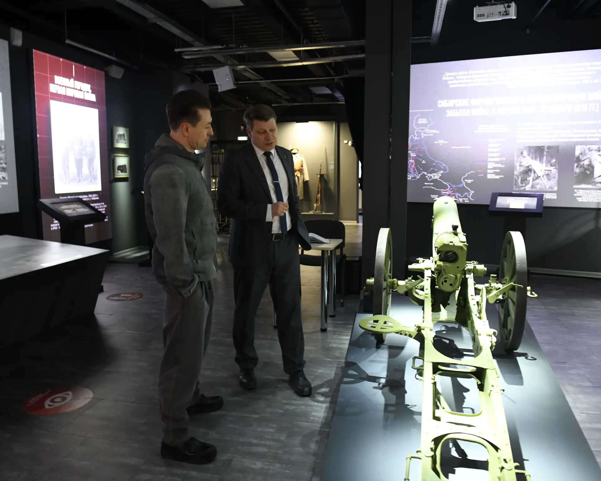 Директор исторического парка «Россия - Моя история» Алексей Пронин провел для знаменитого гостя и участников проекта экскурсию по предметно‑мультимедийной экспозиции «Летопись истории Сибирского воинства» и познакомил с уникальной историей военного городка и здания исторического парка.