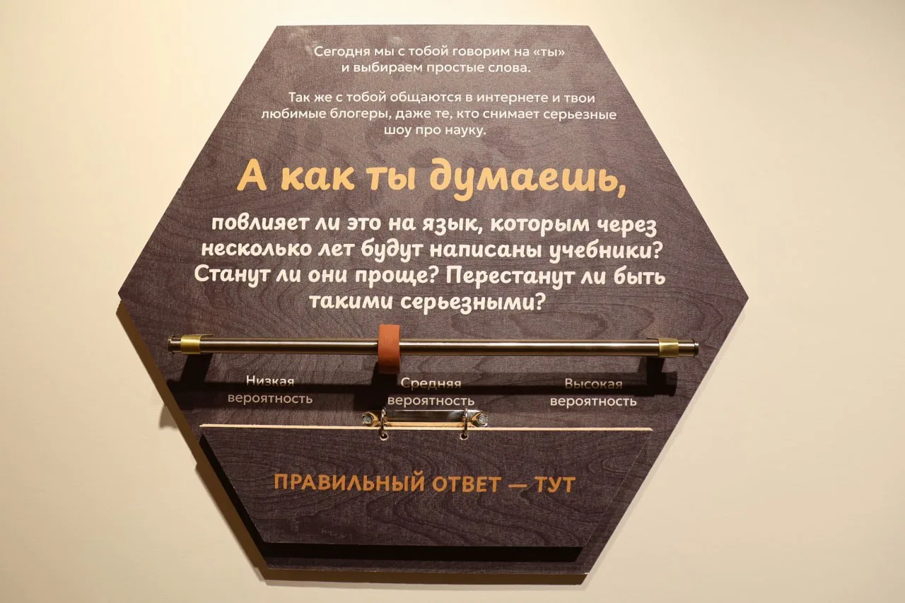В зале «Письменность» можно увидеть берестяные грамоты, глаголицу, кириллицу и древние рукописные книги. На виртуальном станке Ивана Фёдорова посетители попробуют «напечатать» слова, а в студии «Яндекс Книг» — озвучить литературный фрагмент. Цифровые экспозиции рассказывают о Петровской реформе языка, вкладе Ломоносова и Пушкина в его развитие, а также предлагают поразмышлять о будущем русского языка.