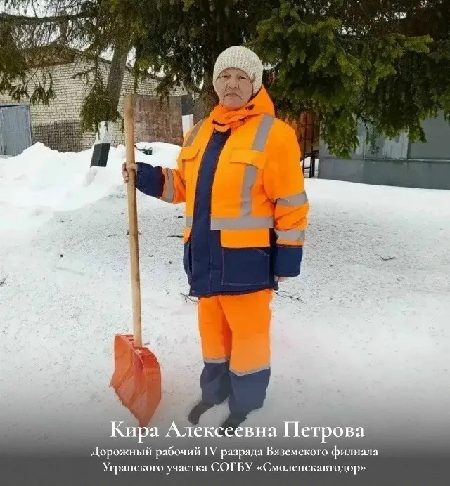 • Кира Алексеевна Петрова – дорожный рабочий IV разряда Вяземского филиала Угранского участка "Смоленскавтодор". Более 20 лет она трудится в дорожной отрасли. Вместе с бригадой рабочих участвует в ямочном ремонте, обслуживании дорожных знаков и остановочных павильонов, а зимой – в очистке объектов дорожной инфраструктуры от снега. Коллеги отмечают ее высокий профессионализм и ответственность и готовность всегда прийти на помощь.
