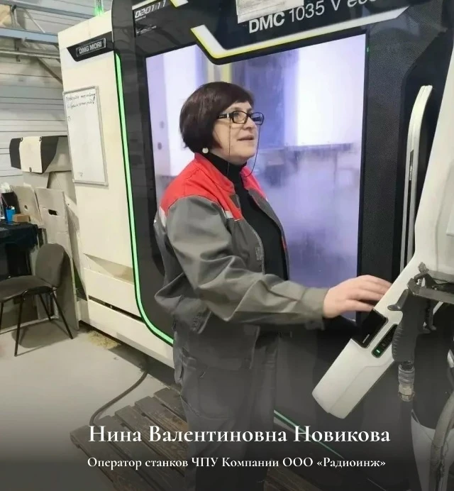 • Нина Валентиновна Новикова – оператор станков с числовым программным управлением компании "Радиоинж", по образованию техник-технолог. Оператором работает с 2017 года, продолжая профессиональную династию – в этой сфере трудятся ее муж и брат. Нина Валентиновна уверенно работает как на токарных, так и на фрезерных программных станках, включая трех- и четырехкоординатные комплексы.
