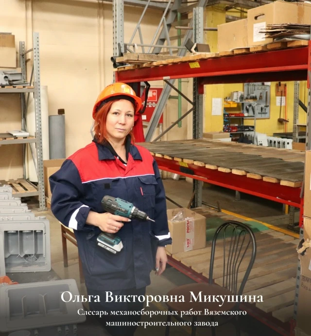 • Ольга Викторовна Микушина работает слесарем механосборочных работ на Вяземском машиностроительном заводе. Свой трудовой путь она начала в сфере торговли. Позже приняла решение освоить рабочую профессию и сегодня успешно трудится в промышленности. В сборочном цехе №1 выполняет ответственные производственные задачи, требующие внимательности, точности и высокой квалификации.