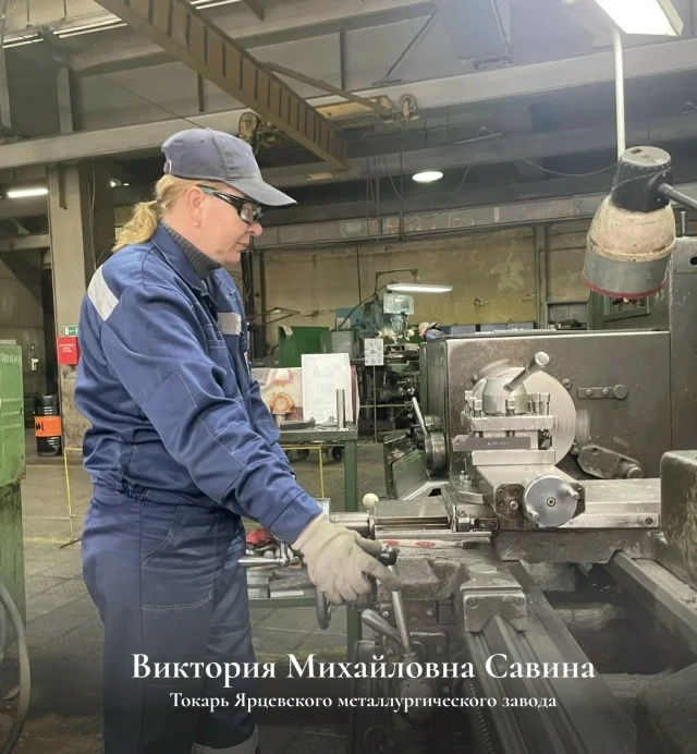 • Виктория Михайловна Савина более восьми лет работает токарем на Ярцевском металлургическом заводе. Профессию она освоила в 2013 году, начав трудовой путь практически с нуля. Признается, что любит свою работу за постоянное развитие и новые задачи. Уверена, что женский взгляд на производственные процессы помогает находить нестандартные решения.