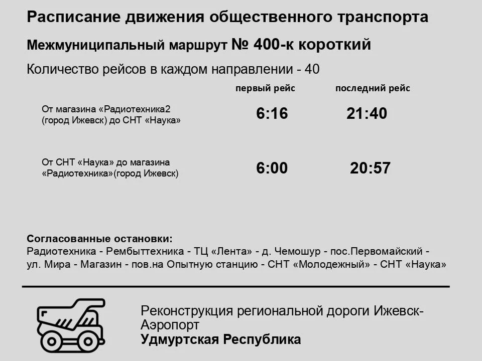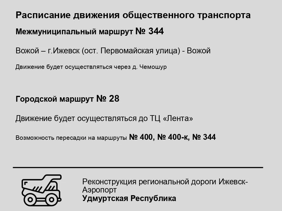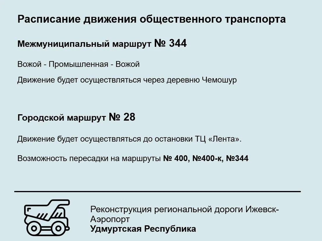 На время проведения основных работ - с 12 декабря - автобусные маршруты № 400, 400-к, 344 из Ижевска в с. Первомайский пойдут через д. Чемошур. Городской автобус №28 - конечная остановка ТЦ "Лента".