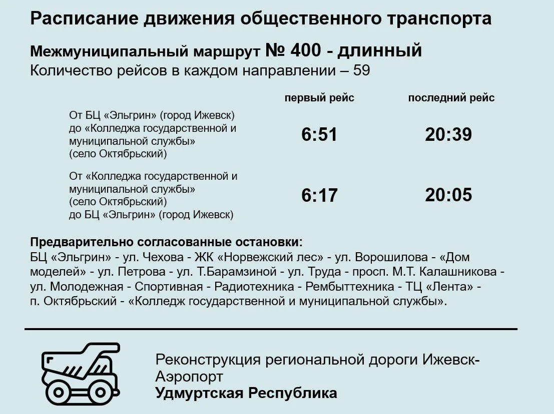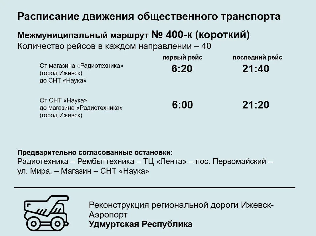 12 декабря в связи с предстоящим перезапуском движения на реконструируемой дороге Ижевск-Аэропорт по объездным путям, а также закрытием движения по этой дороге в п.Первомайский перезапускается движение межмуниципального общественного транспорта № 400, №344.