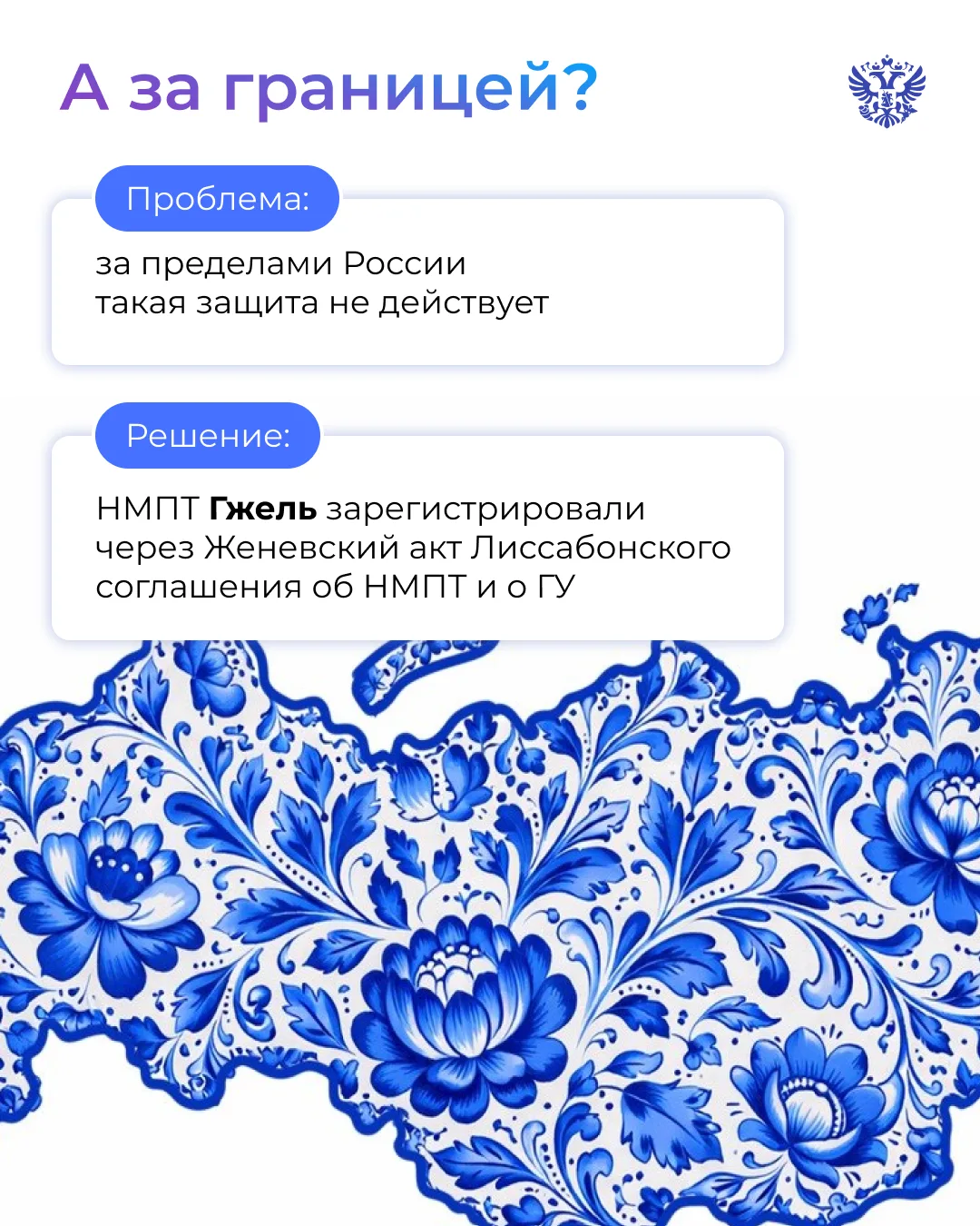 Гжель стала первым НМПТ из России, которое получило международную правовую охрану в Лиссабонской системе международной регистрации НМПТ и географических указаний.