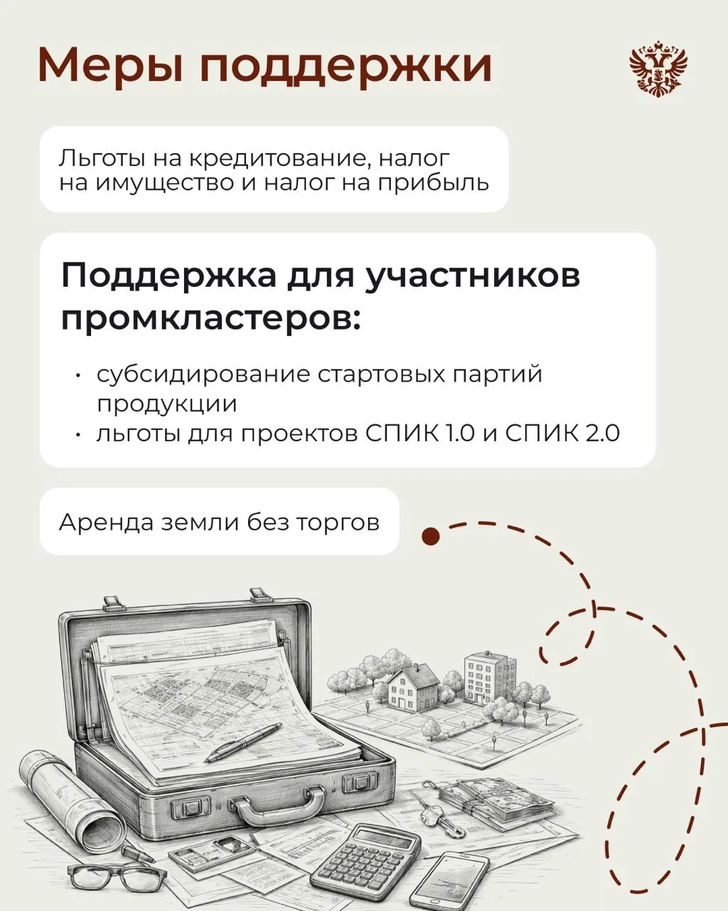 🔘 сниженные цены на аренду и выкуп земли — не надо вкладывать миллионы в площадь для работы, можно потратить их на своё развитие