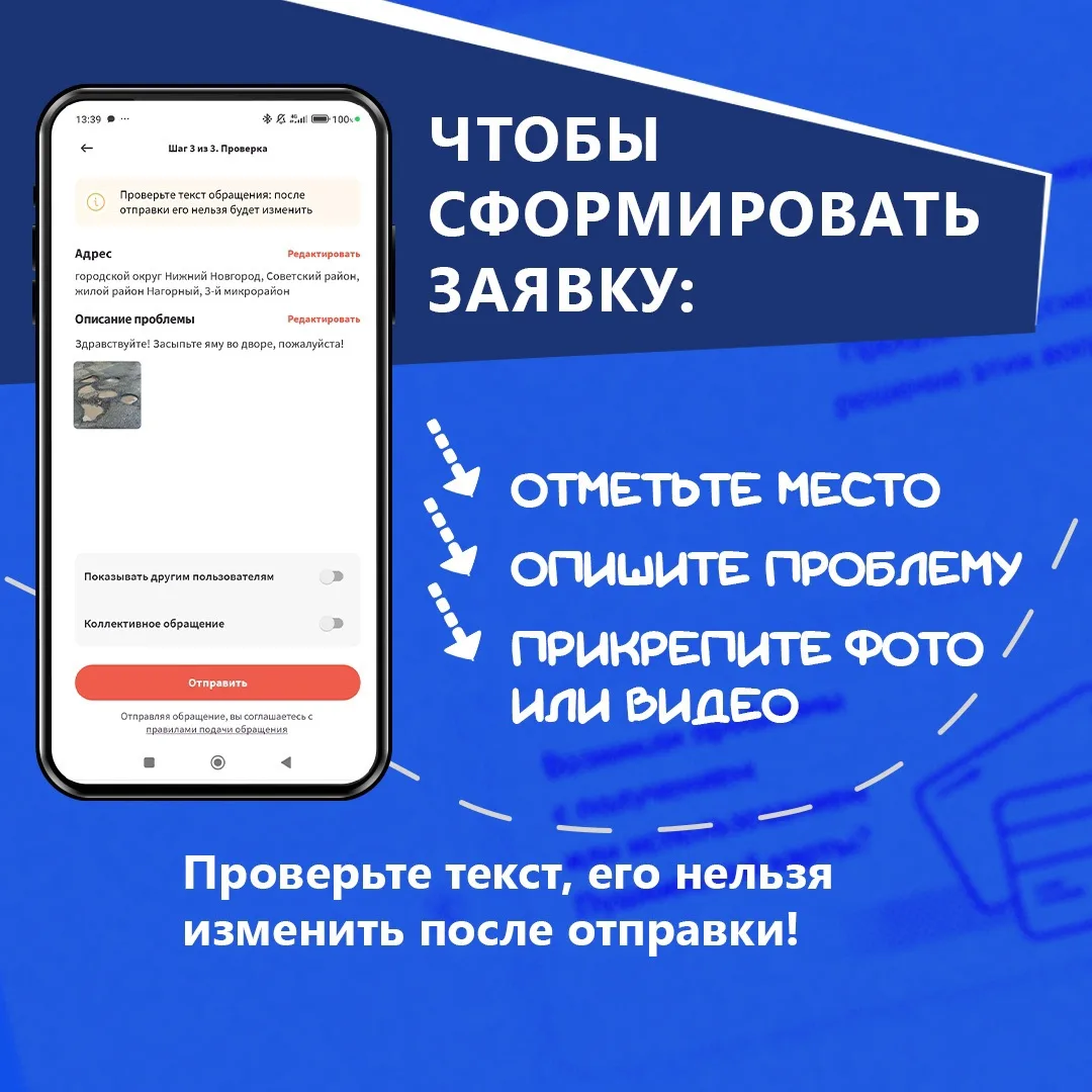 С ПОС это просто: отметьте место, опишите проблему и прикрепите фото или видео — ваша заявка сразу попадёт в нужное ведомство, а ответ придёт в личный кабинет.