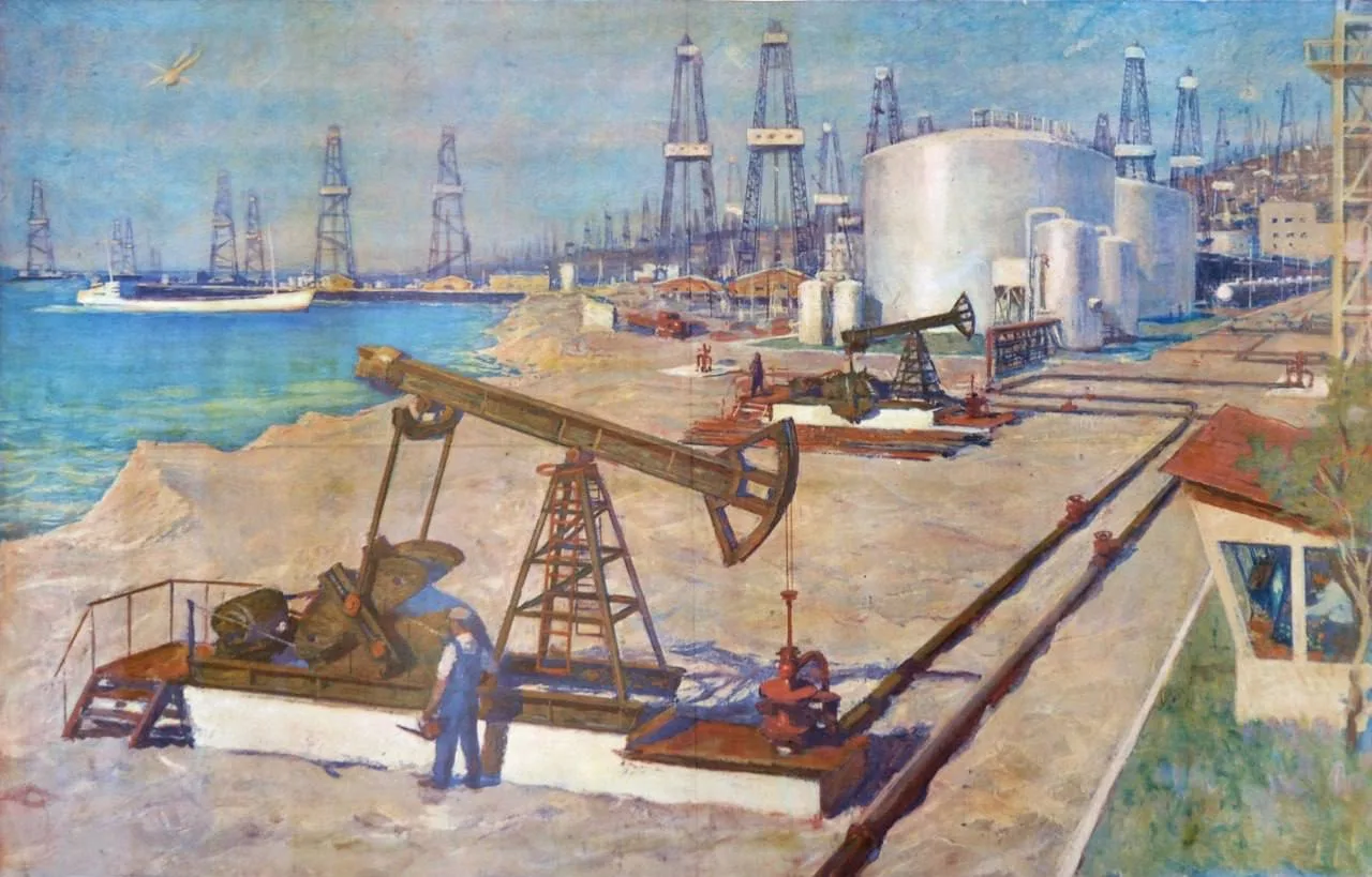 🛢️ Время выпуска плаката относится к началу VIII пятилетки (1966-1970 гг.). В то время разведка морских и прибрежных нефтяных месторождений все также занимала важное место в развитии промышленности.