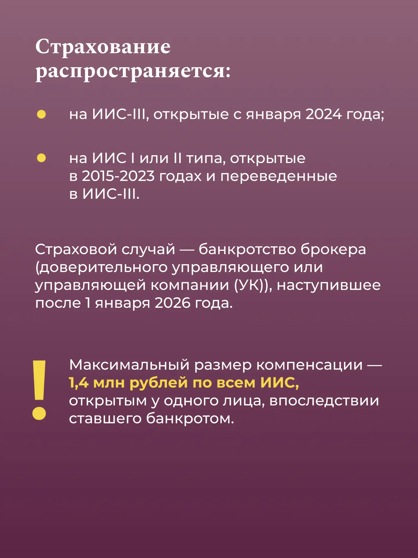 🟢 С 2026 года владельцы таких счетов могут получить компенсацию при банкротстве брокера (доверительного управляющего или управляющей компании) – по аналогии с банковскими вкладами.