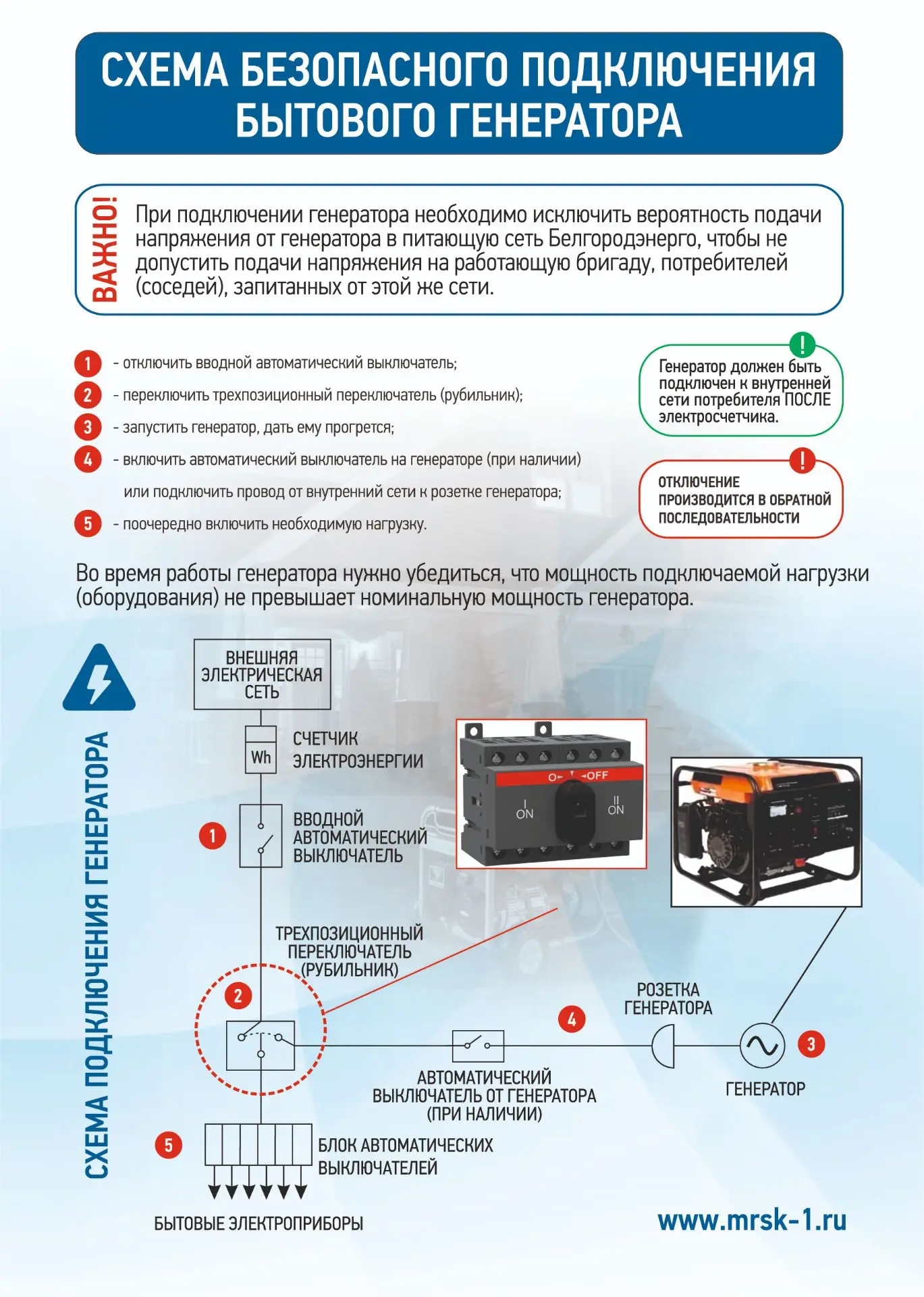 ❗Филиал «Россети Центр» - «Белгородэнерго» напоминает❗Подключать индивидуальные дизельные и бензиновые генераторы нужно четко в соответствии с инструкцией и обязательно ПОСЛЕ электросчетчика. Это необходимо для того, чтобы исключить электроэнергию, выработанную генератором, из расчетных платежей.