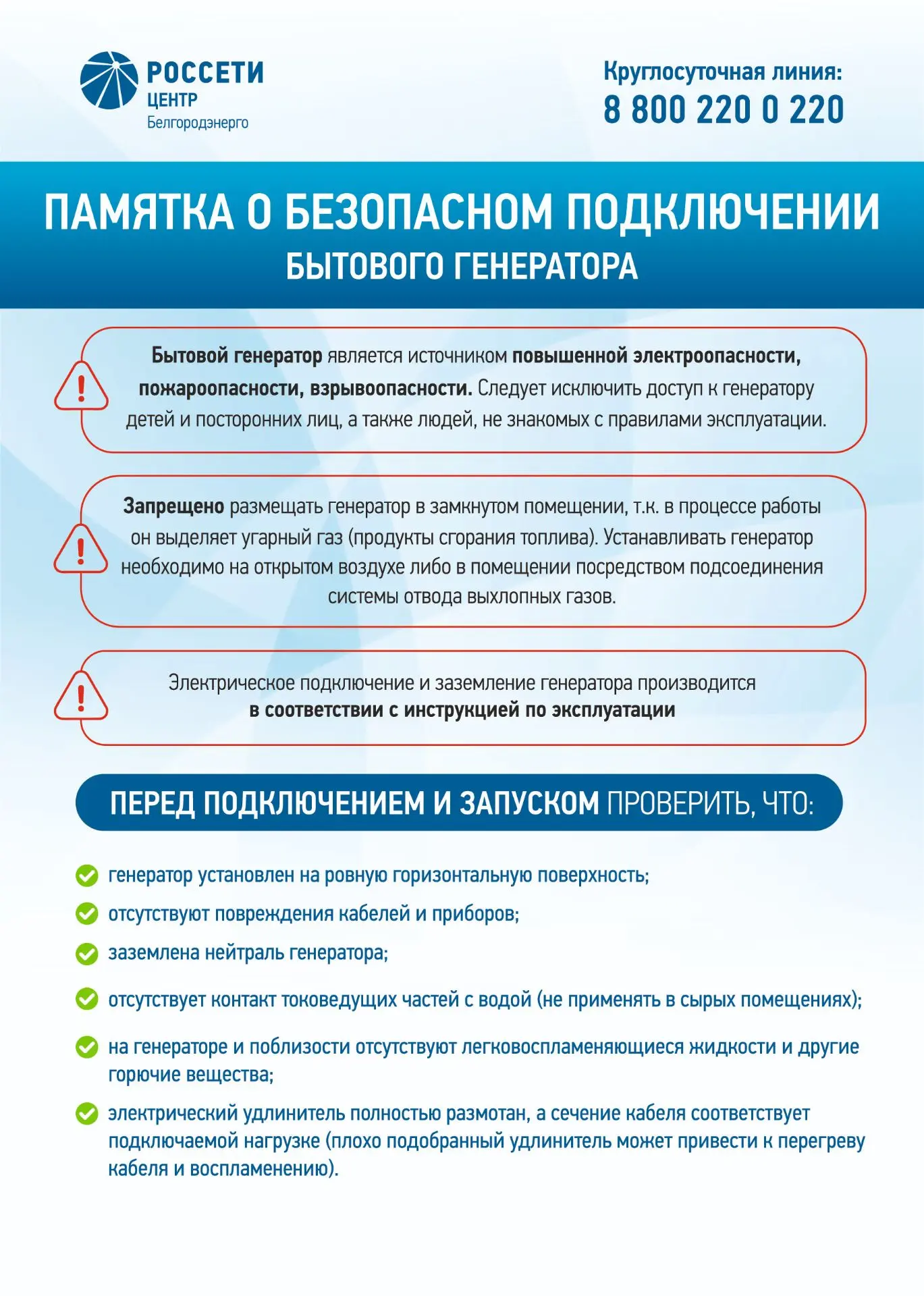 Напоминаем, что неправильное подключение и эксплуатация устройств могут вызвать перепады напряжения, спровоцировать пожар, отравление людей угарным газом, привести к травмированию энергетиков, которые в это время работают на линиях электропередачи.