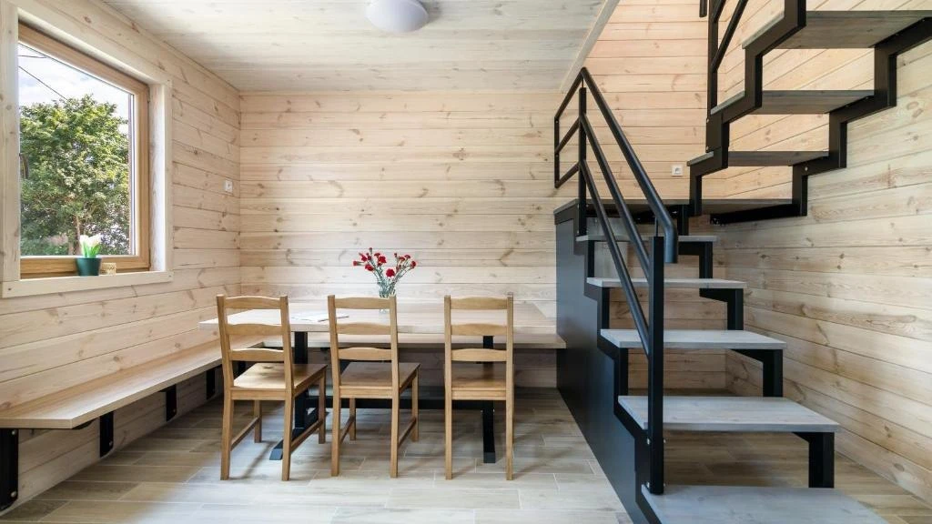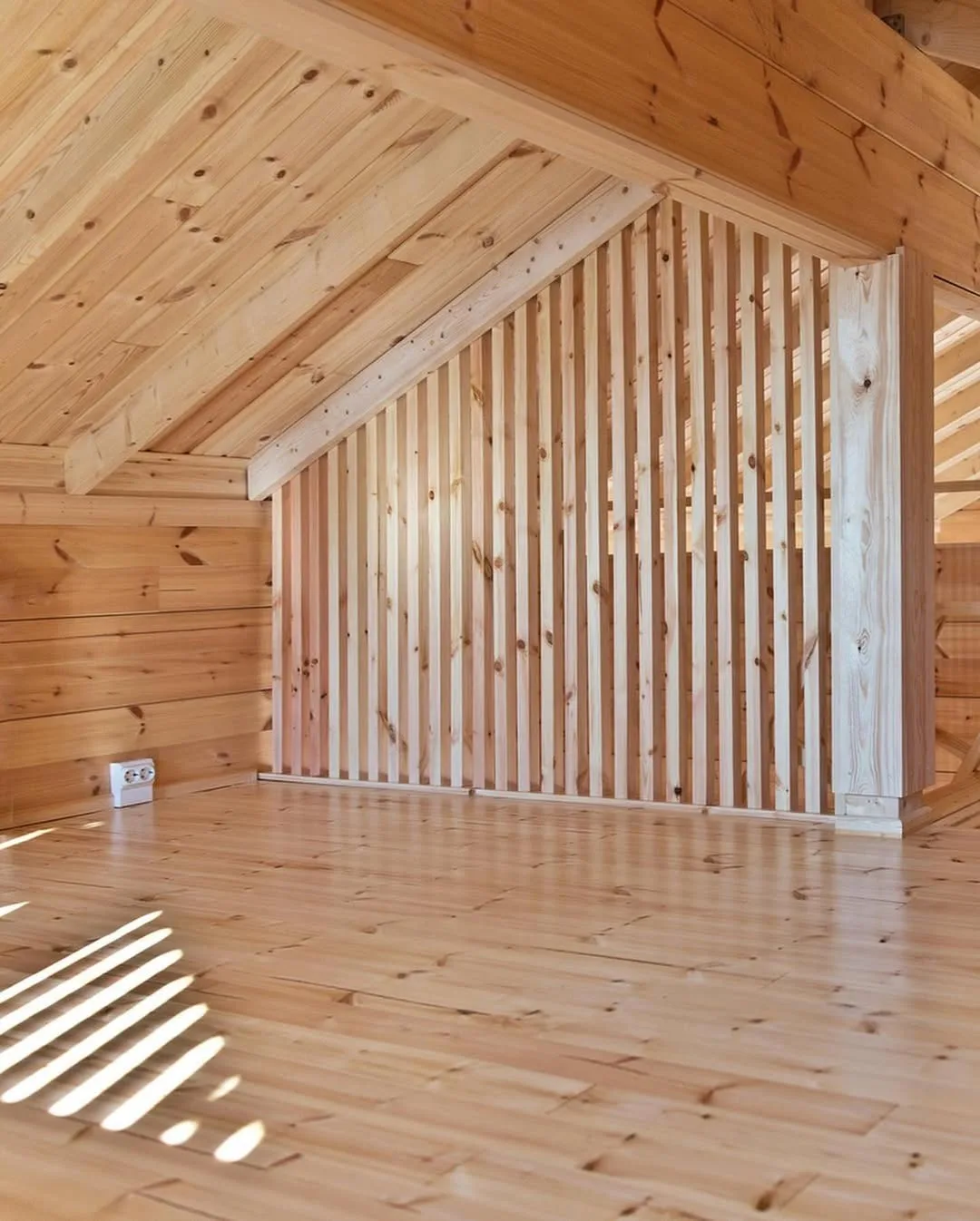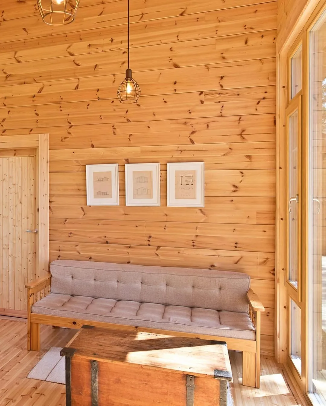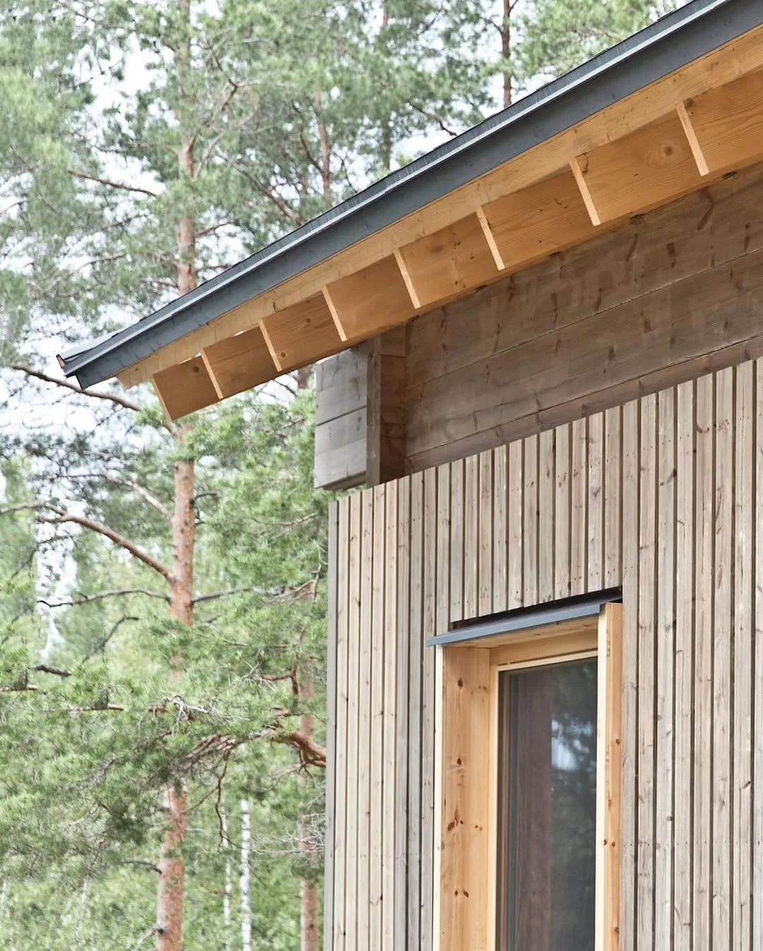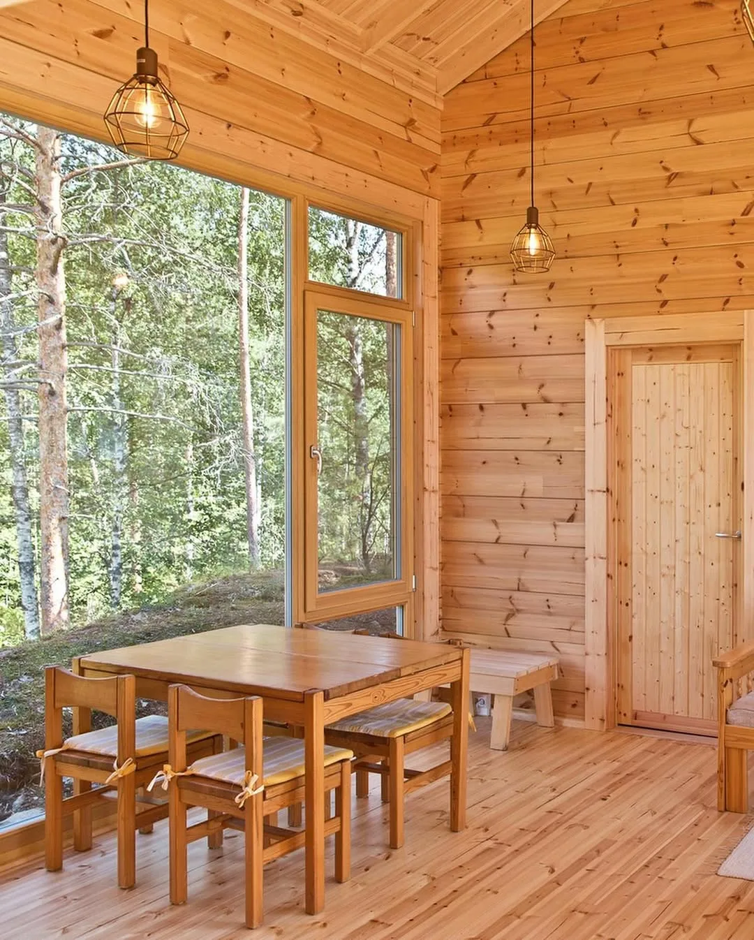 Лесной домик площадью 30м2 с натуральным фасадом из нестроганой доски и деревянным интерьером с открытыми балками.